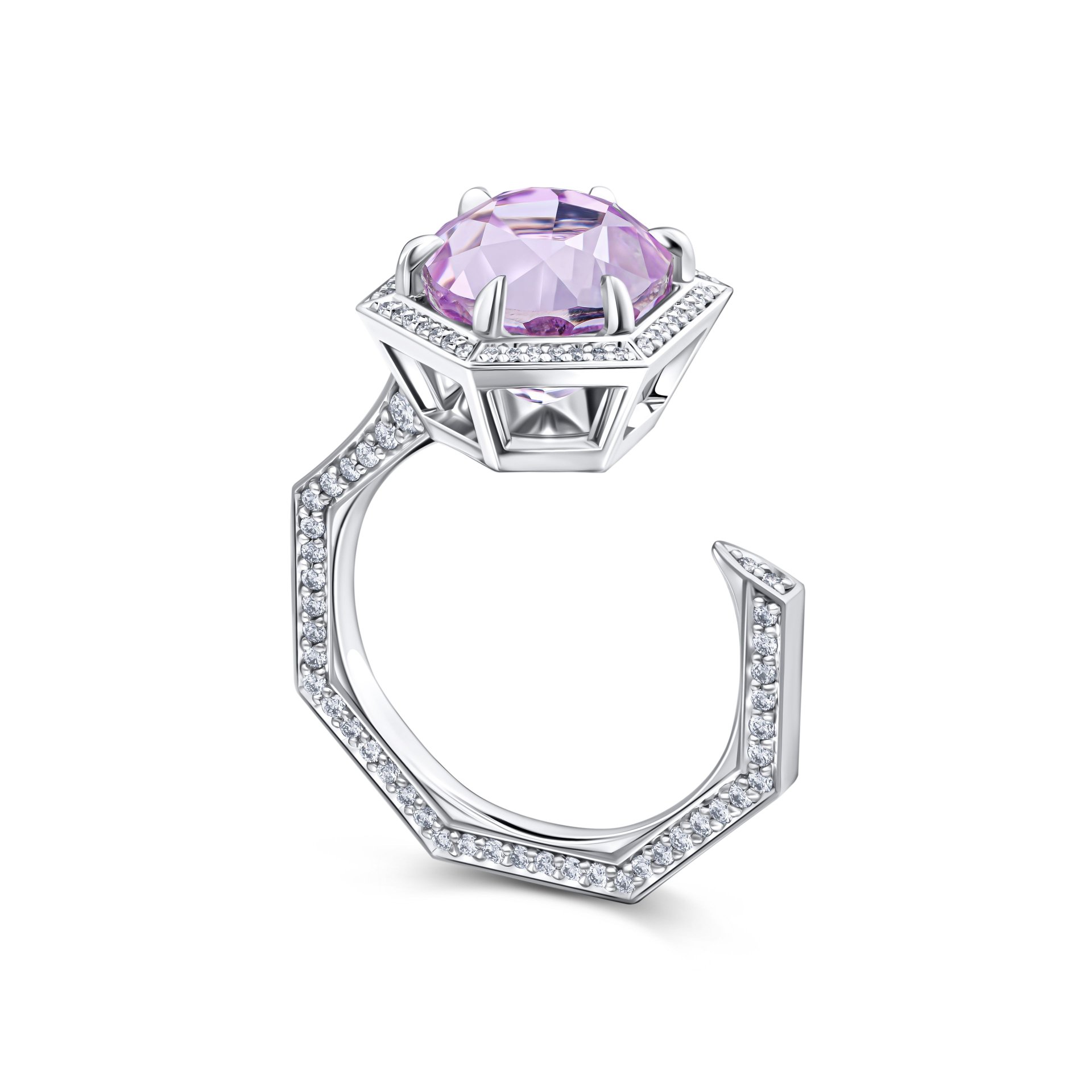 Кольцо с кунцитом 5.47 карат — это истинное воплощение утончённой элегантности. Центральный камень, сияющий кунцит, весом 5.47 карата, пленяет своим нежным фиолетовым оттенком, создавая атмосферу романтики и изысканности. Его шестигранная оправа из белого золота подчёркивает уникальный характер камня, добавляя современный штрих к классическому дизайну.