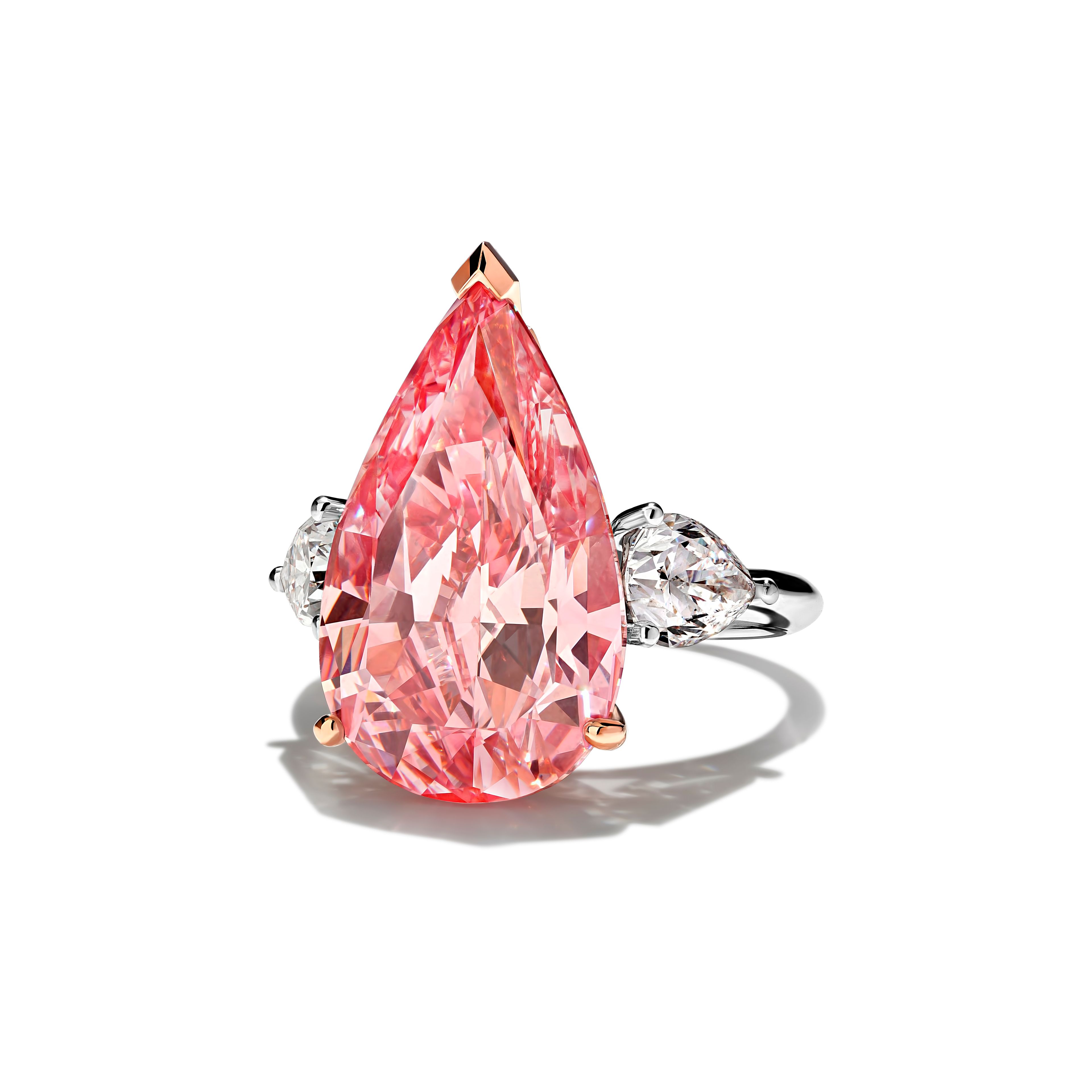 Розовый бриллиант весом 10 карат, грациозно огранённый в форме капли, становится центральным акцентом украшения «La Vie en rose». Его мягкий оттенок органично дополняется двумя белыми бриллиантами по бокам, создавая гармоничный контраст и подчёркивая изящество композиции. Основой служит белое золото, которое придаёт изделию современный и сдержанный вид, позволяя камням раскрыть всю глубину цвета и блеска.