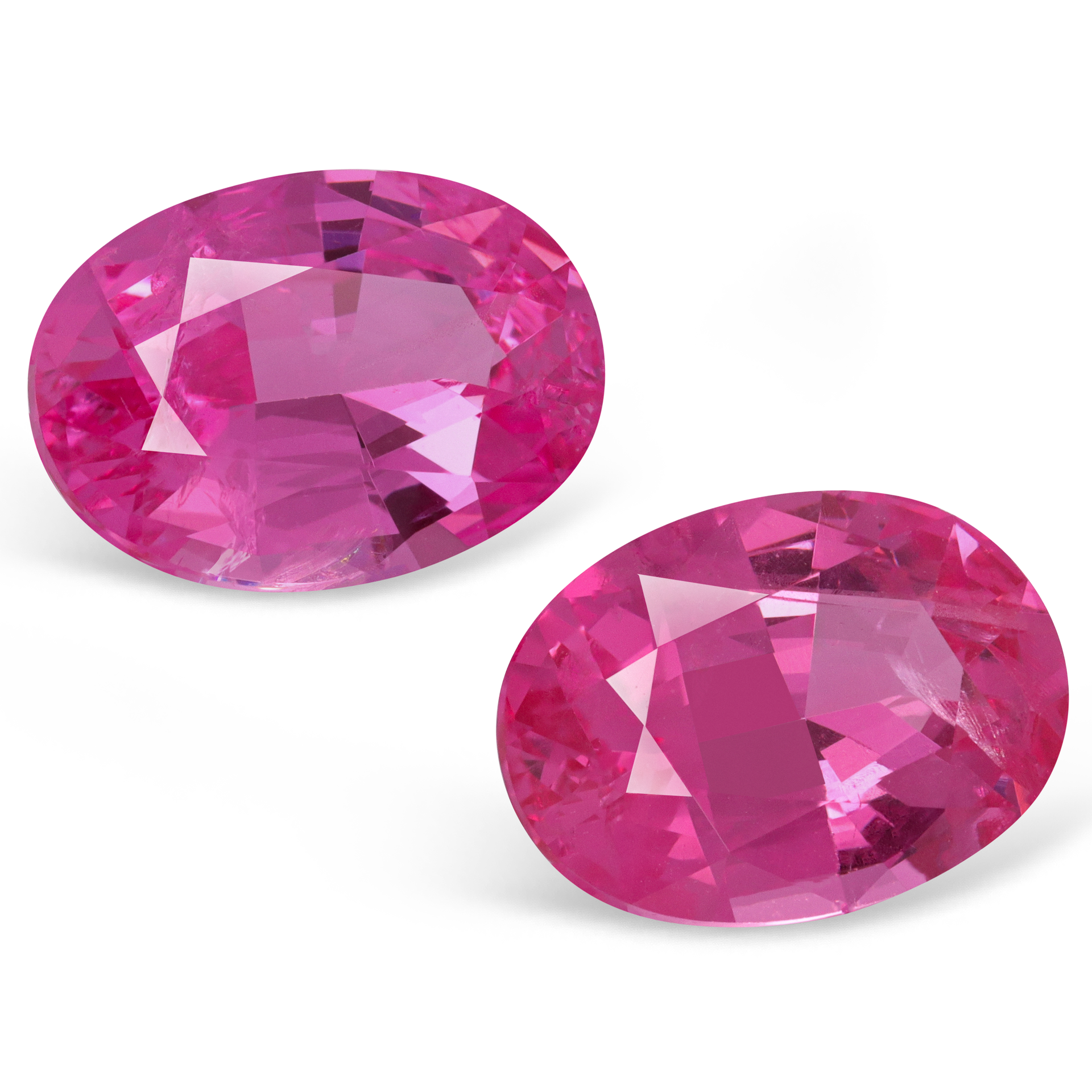 Шпинель — драгоценный камень, который отличается насыщенным розовым оттенком и прозрачностью, создавая эффект живого сияния. В этой паре представлены два овальных шпинеля, весом 0.75 и 0.81 карата, каждый из которых обладает своей уникальной игрой света и глубиной цвета. Камни тщательно огранены, что подчеркивает их природную красоту и позволяет максимально раскрыть яркость оттенков.