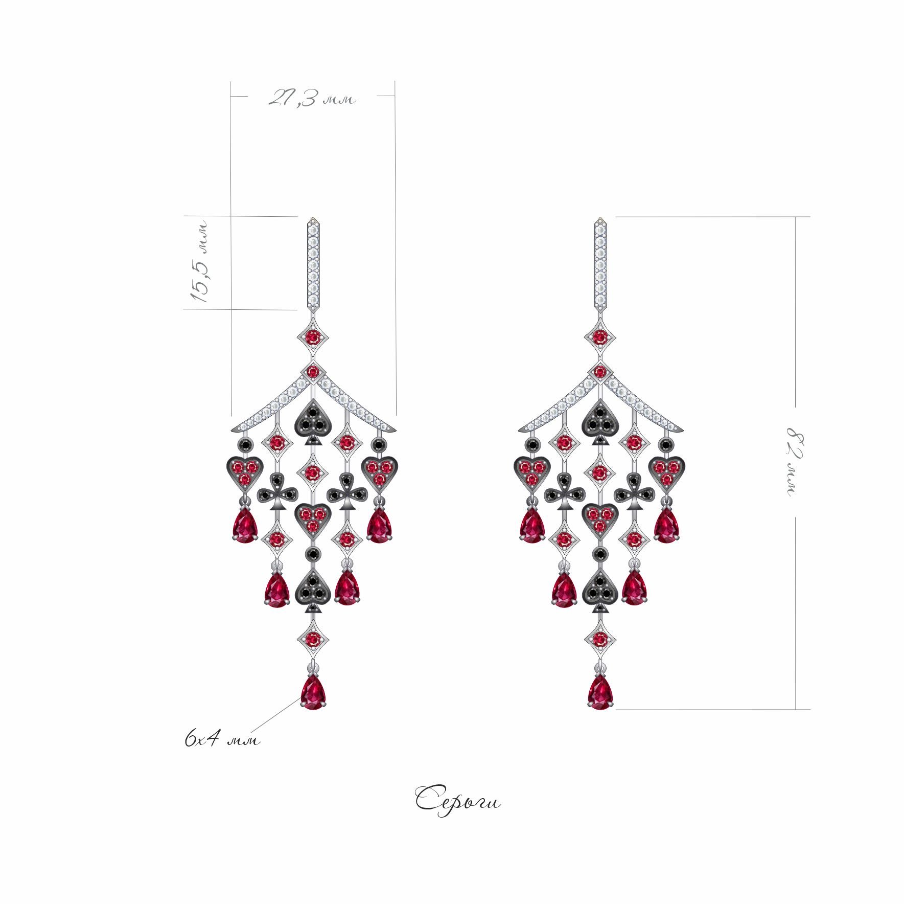 Серьги-шандельеры «Масти» — это воплощение игривой элегантности и утонченного стиля. Изящные линии белого золота создают основу для впечатляющей композиции, где каждый элемент словно карта из колоды. Центральное место занимают бриллианты, рубины и гранаты, общий вес которых составляет 5.671 карата. Эти драгоценные камни, сверкая и переливаясь, создают эффектный танец света и цвета, притягивая взгляды и вызывая восхищение.