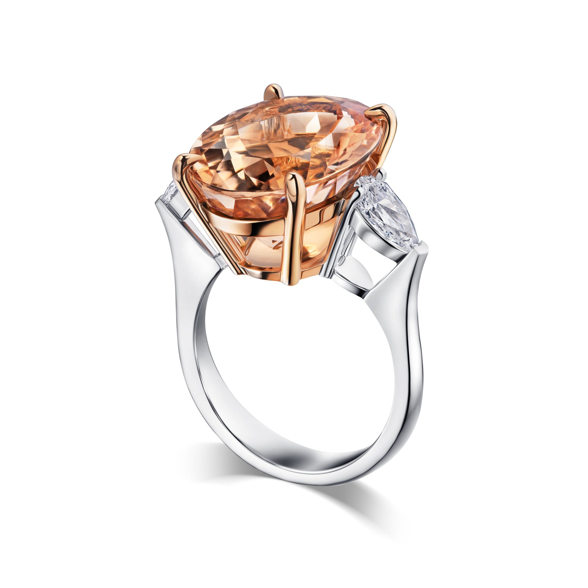 Кольцо с морганитом 10.59 карат привлекает внимание крупным овальным камнем насыщенного персикового оттенка. Центральный морганит весом 10.59 карата отличается прозрачностью и выразительной огранкой, которая подчеркивает глубину цвета и игру света. По бокам расположены два бриллианта грушевидной формы, создающие гармоничное сочетание и усиливающие блеск основного камня. Белое золото, использованное в основе изделия, служит нейтральным фоном, который выгодно выделяет теплые тона морганита и добавляет изделию современный минималистичный акцент.
