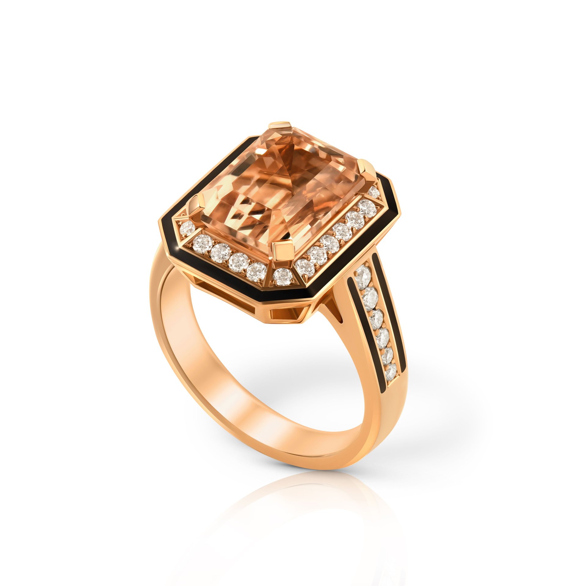 Кольцо с морганитом от Parure Atelier представляет собой утонченное сочетание высокого мастерства и благородных материалов. Центральный камень – морганит огранки октагон – обладает весом 5.46 карат и завораживает мягким персиковым оттенком, который элегантно подчеркивает теплый блеск розового золота 750 пробы. Бриллианты общей массой 0.561 карат, искусно закрепленные по краю оправы и вдоль ободка, добавляют сияния и подчеркивают гармоничность дизайна.