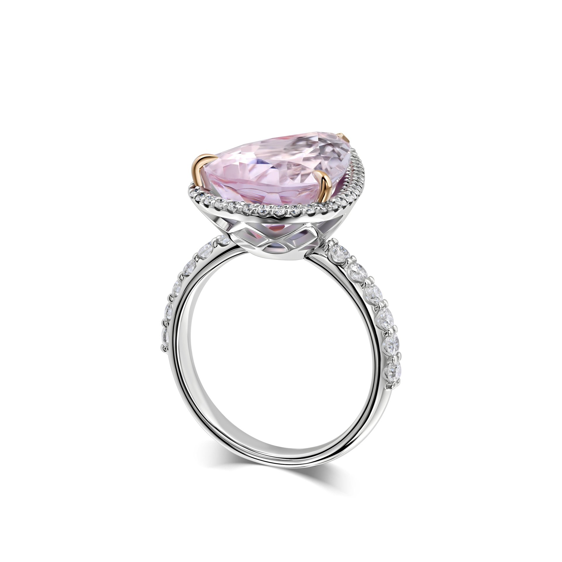 Элегантное кольцо, украшенное центральным камнем морганитом весом 7.81 карат, выполнено из белого золота 750 пробы, подчеркивая тонкий вкус своего владельца. Камень имеет привлекательную огранку в форме груши, что добавляет изделию особенный шарм и выразительность. Вокруг морганита расположен ряд изящных бриллиантов общим весом 0.691 карат с традиционной круглой огранкой, которые эффектно искрятся при любом освещении.