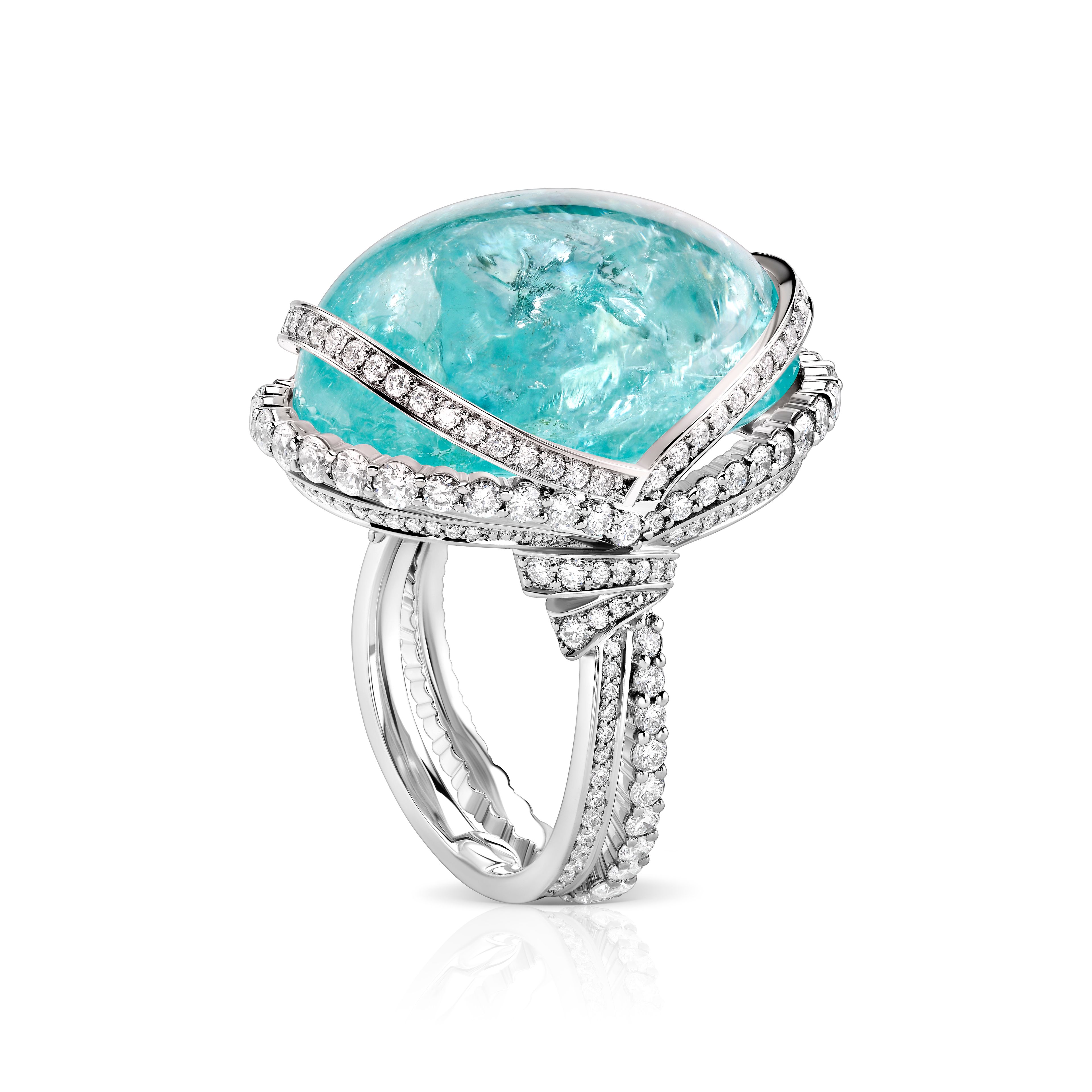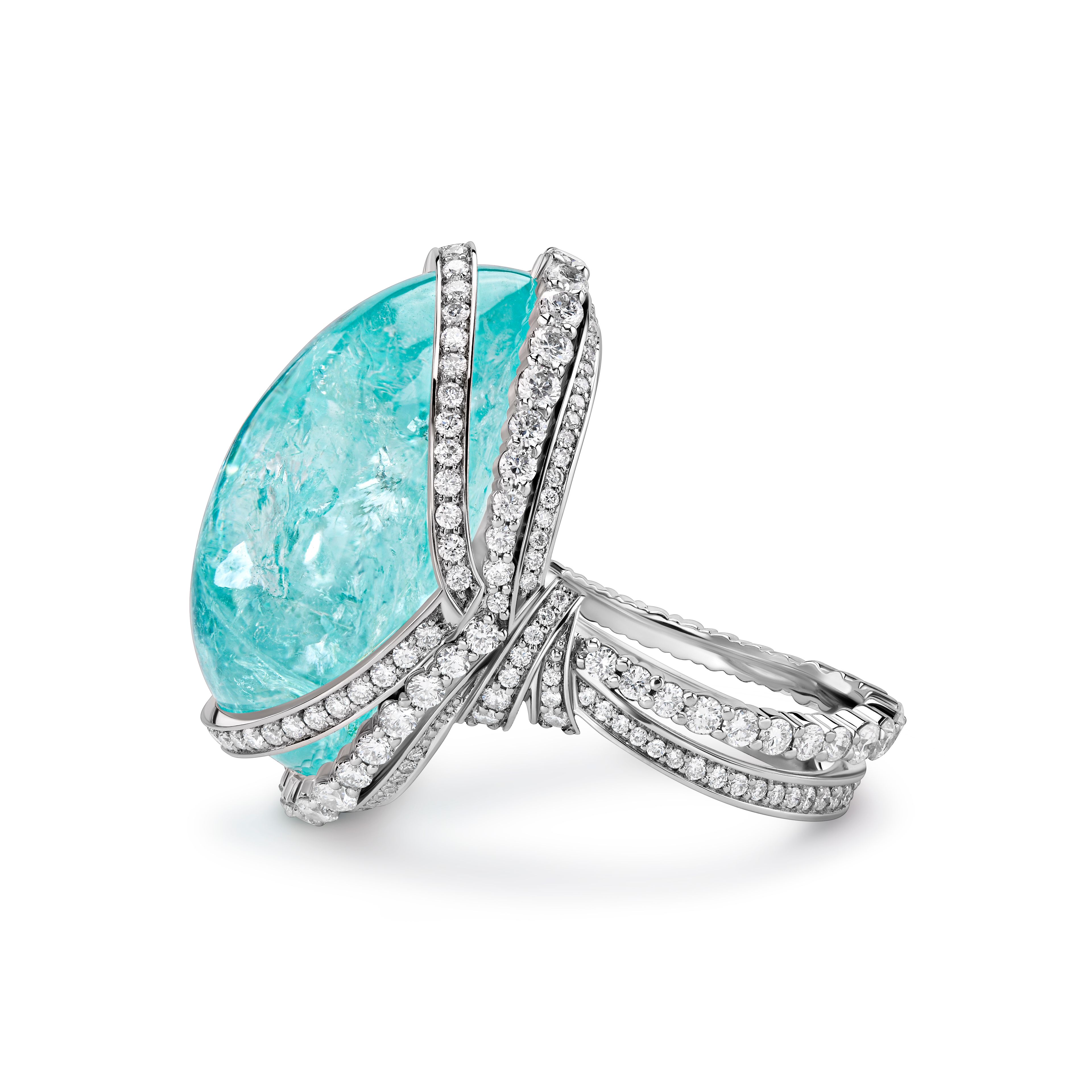 Артикул: R2906Турмалин Параиба весом 39.34 карата занимает центральное место в украшении «Ocean of Serenity». Его глубокий бирюзовый оттенок с легкими переливами создает впечатление прозрачной морской глади, отражающей свет и меняющейся при каждом движении. Камень обрамлен изящной оправой из белого золота, дополненной аккуратной дорожкой из мелких бриллиантов, которые подчеркивают естественную красоту центрального минерала и придают изделию завершенный вид. Форма камня напоминает каплю воды, что усиливает ассоциацию с морской темой и придает украшению особую выразительность.