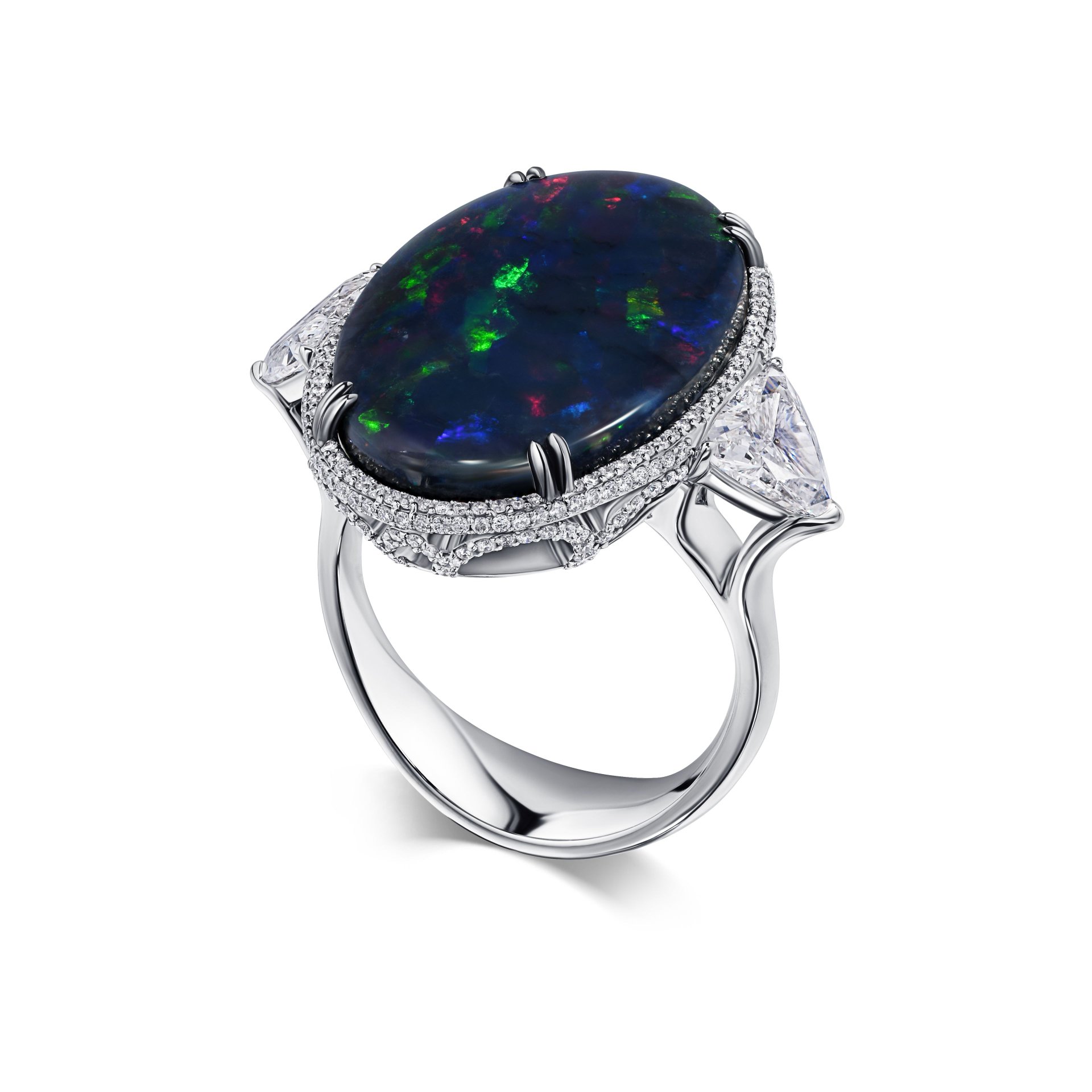 Великолепное кольцо с опалом 13.86 карата станет настоящим украшением вашей коллекции. Этот опал, словно окно в загадочный мир, переливается множеством оттенков, создавая эффект завораживающего сияния. Его окружает изящная оправа из белого золота, подчёркивающая глубину и насыщенность камня. По бокам кольцо украшено двумя треугольными бриллиантами, которые добавляют композиции ещё больше блеска и элегантности.
