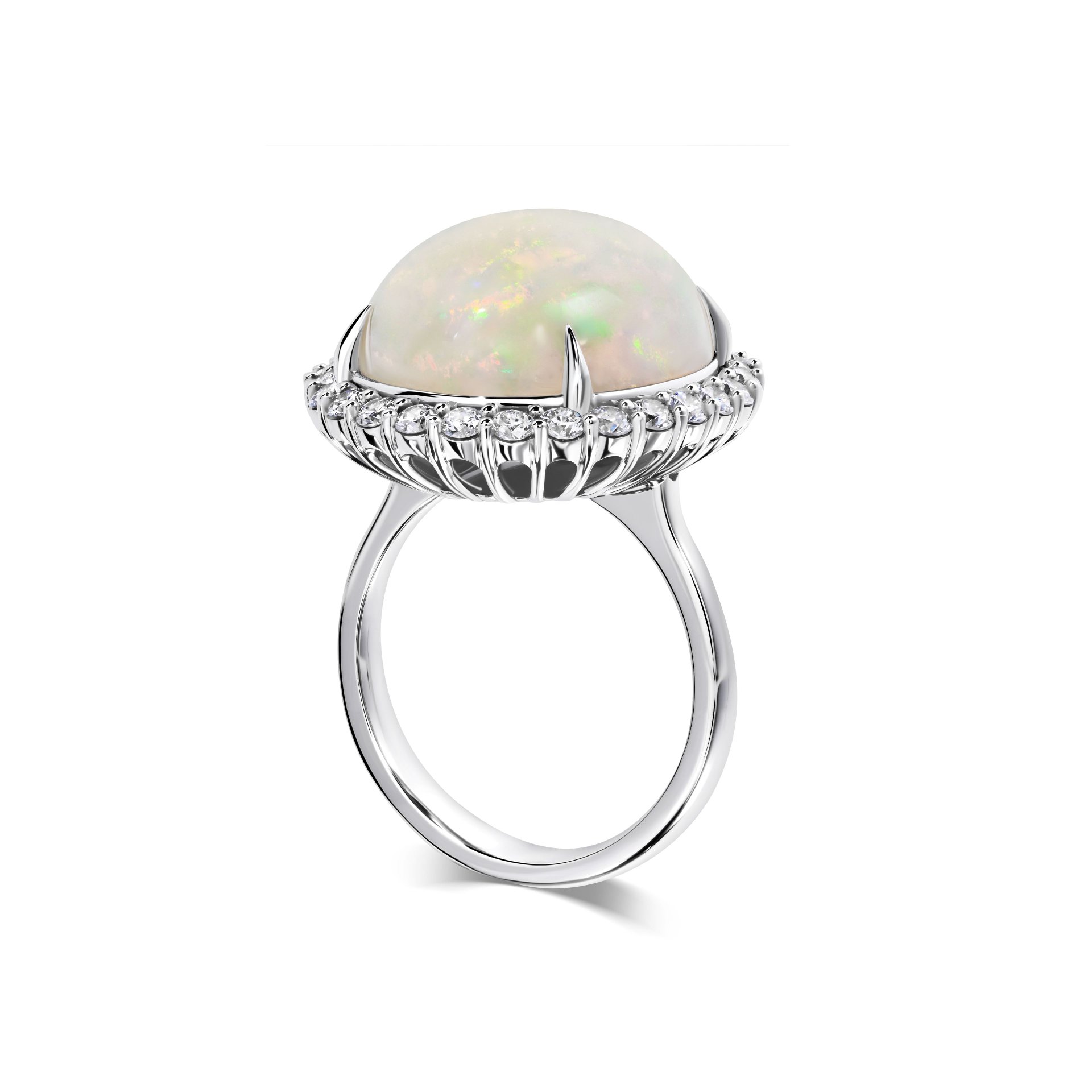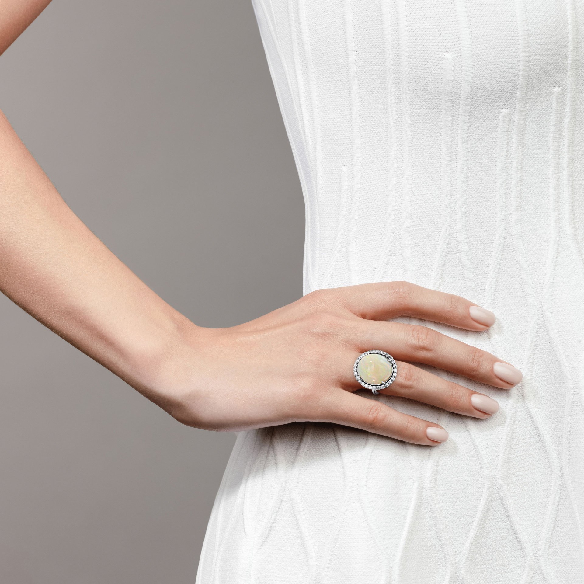 Великолепное кольцо с опалом весом 12.14 карата притягивает взгляд своим чарующим блеском и магическим сиянием. Центральный камень, словно живой, играет всеми цветами радуги, создавая эффект таинственного сияния. Его окружает изящная россыпь бриллиантов общей массой около 0.907 карата, которые добавляют украшению дополнительную мерцающую глубину. Круглая огранка боковых камней усиливает игру света, подчеркивая красоту центрального опала.