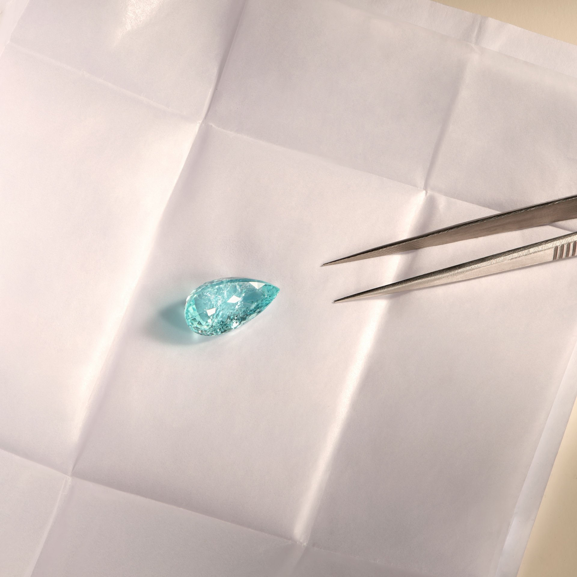 Турмалин Параиба весом 15.72 карата привлекает внимание своей насыщенной бирюзово-голубой палитрой и выразительной огранкой в форме капли. Этот камень выделяется редким оттенком, который сложно встретить в природе, что делает его желанным элементом для ювелирных изделий. Его прозрачность и игра света создают эффект глубины, подчеркивая уникальность каждой гранки.