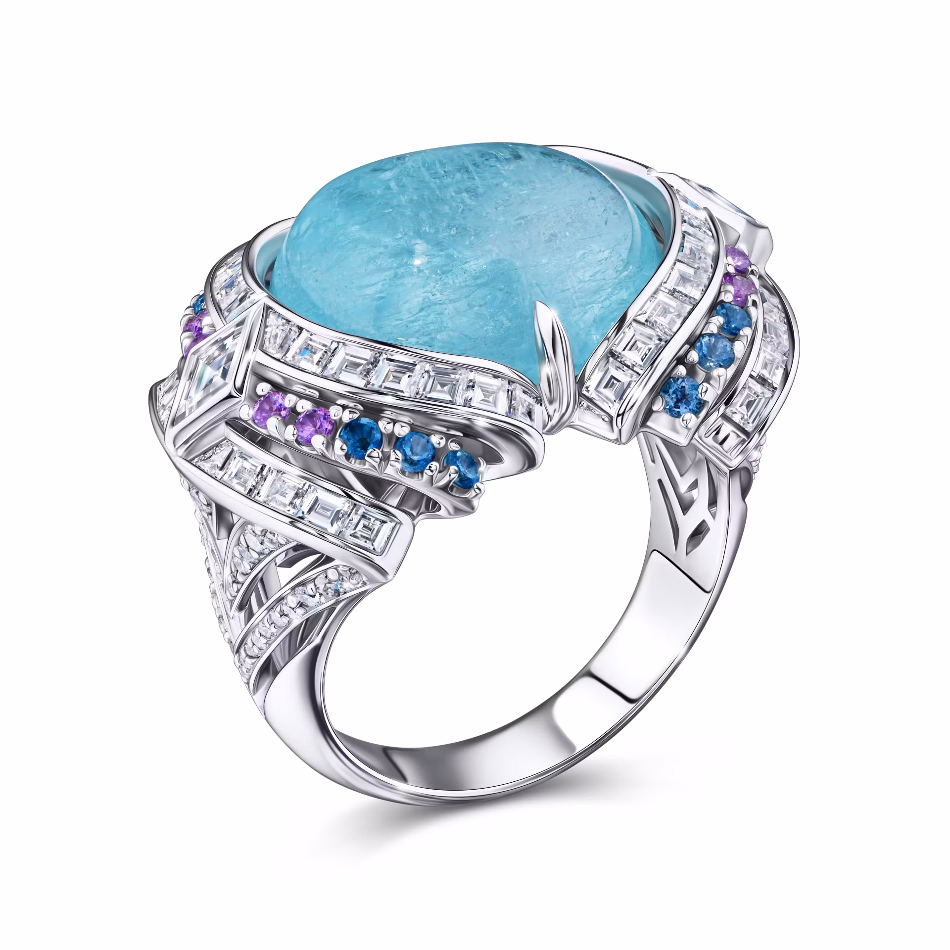 Центральные элементы композиции — турмалины параиба редкой для них формы «кабошон». Плавные линии контрастируют с заострёнными элементами, напоминающими паруса. Игру цвета поддерживают кунциты и аквамарины огранки «груша», а также топазы, жёлтые, лавандовые и синие сапфиры огранки «круг».