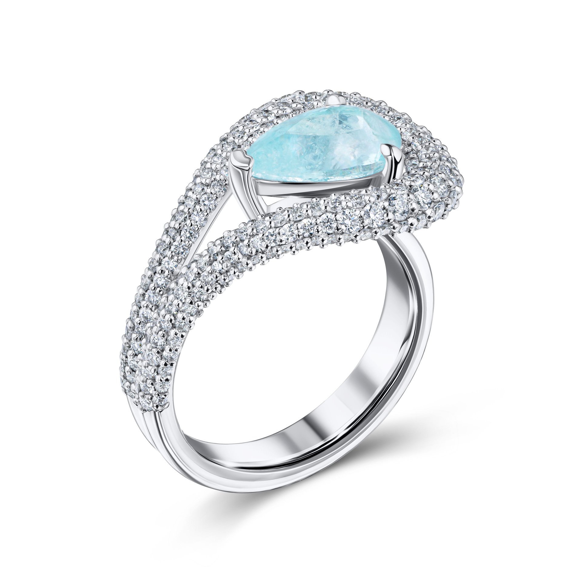 Кольцо с турмалином Параиба 2 карат привлекает внимание необычным оттенком центрального камня — ярким голубовато-зеленым цветом, характерным для этого редкого минерала. Турмалин весом 2 карата огранен в форме капли, что подчеркивает его природную глубину и прозрачность. Обрамление из белого золота дополнено множеством мелких бриллиантов, аккуратно расположенных в три ряда, создавая эффект сияющей рамки вокруг центрального камня. Такое сочетание подчеркивает выразительность турмалина, не отвлекая от его естественной красоты.
