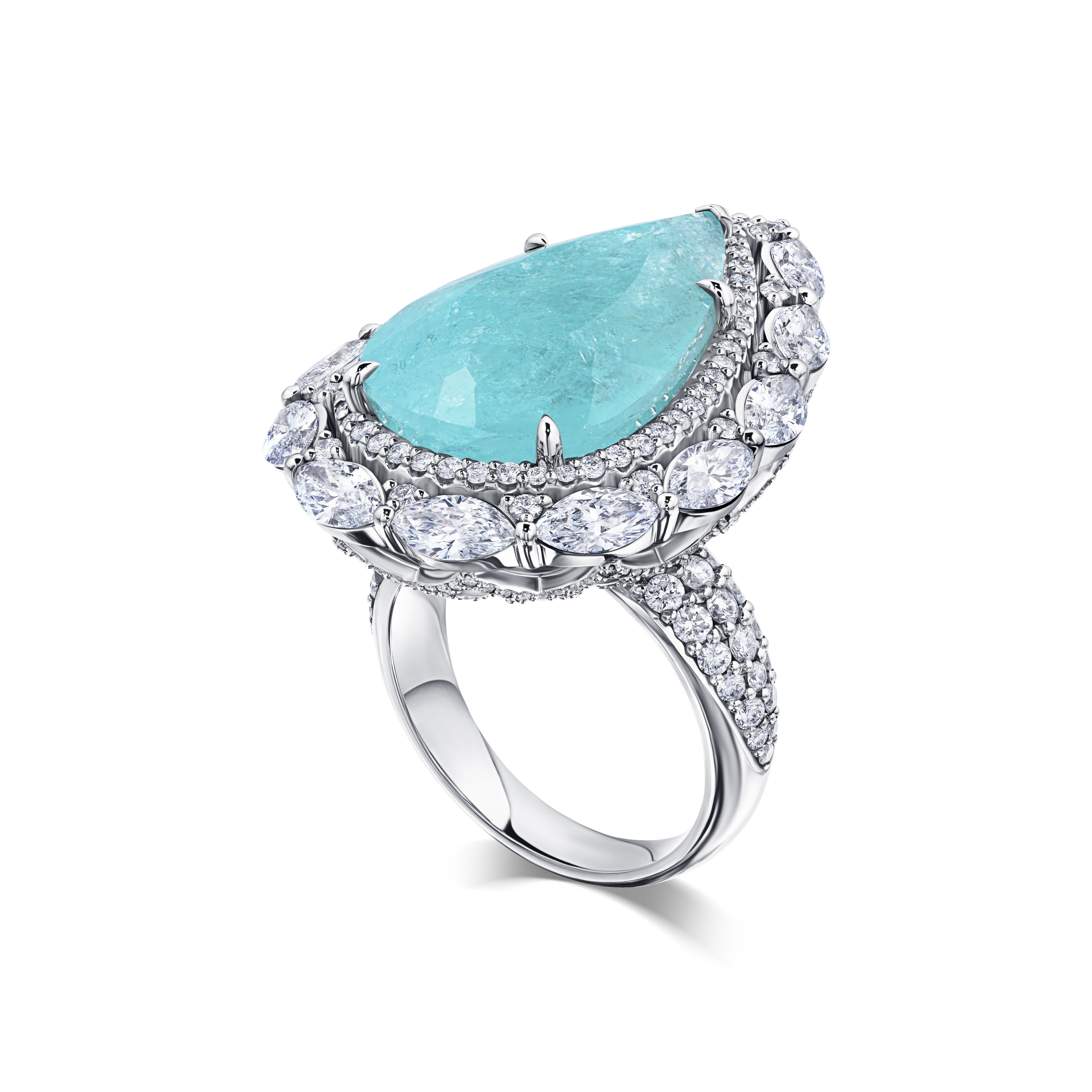 Артикул: R5225Восхитительное украшение, которое завораживает с первого взгляда, — «Кольцо с турмалином параиба 21.77 карат». Центральный камень, турмалин параиба, весом 21.77 карата, поражает своей насыщенной голубой палитрой, напоминая о морских глубинах и бескрайних небесах. Этот редкий и ценный минерал окружён бриллиантами общей массой около 3.86 карата, огранки маркиз и груша, которые создают ослепительный ореол вокруг центрального камня, усиливая его природное сияние.