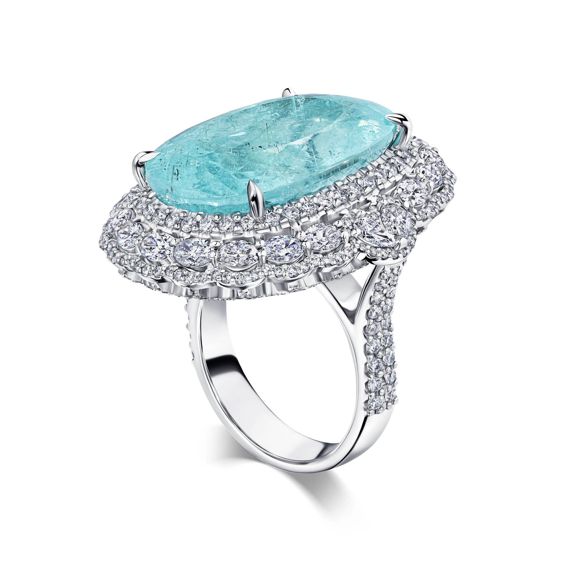 Кольцо с турмалином Параиба 24.64 карата привлекает внимание насыщенным голубым оттенком центрального камня, который занимает ключевое место в дизайне изделия. Турмалин Параиба весом 24.64 карата отличается выразительной прозрачностью и глубиной цвета, создавая эффект легкости и воздушности. Овальная огранка камня подчеркивает его природную красоту и объем.