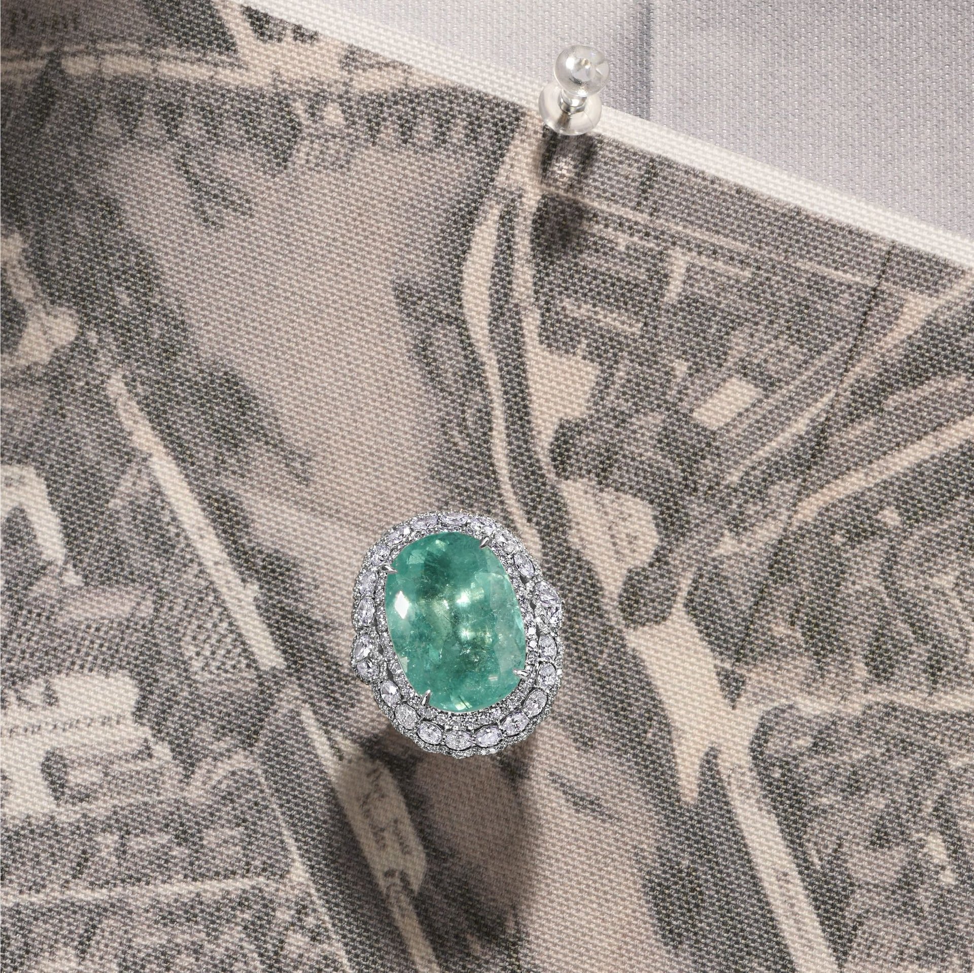 Обрамление из белого золота дополняет композицию, усиливая сияние турмалина и создавая гармоничный контраст. Вокруг центрального камня расположены аккуратные ряды мелких бриллиантов, которые добавляют изделию дополнительный блеск и визуальную динамику, не отвлекая внимания от главного акцента. Крепления выполнены так, чтобы максимально подчеркнуть форму и цвет камня, обеспечивая надежность и комфорт при носке.