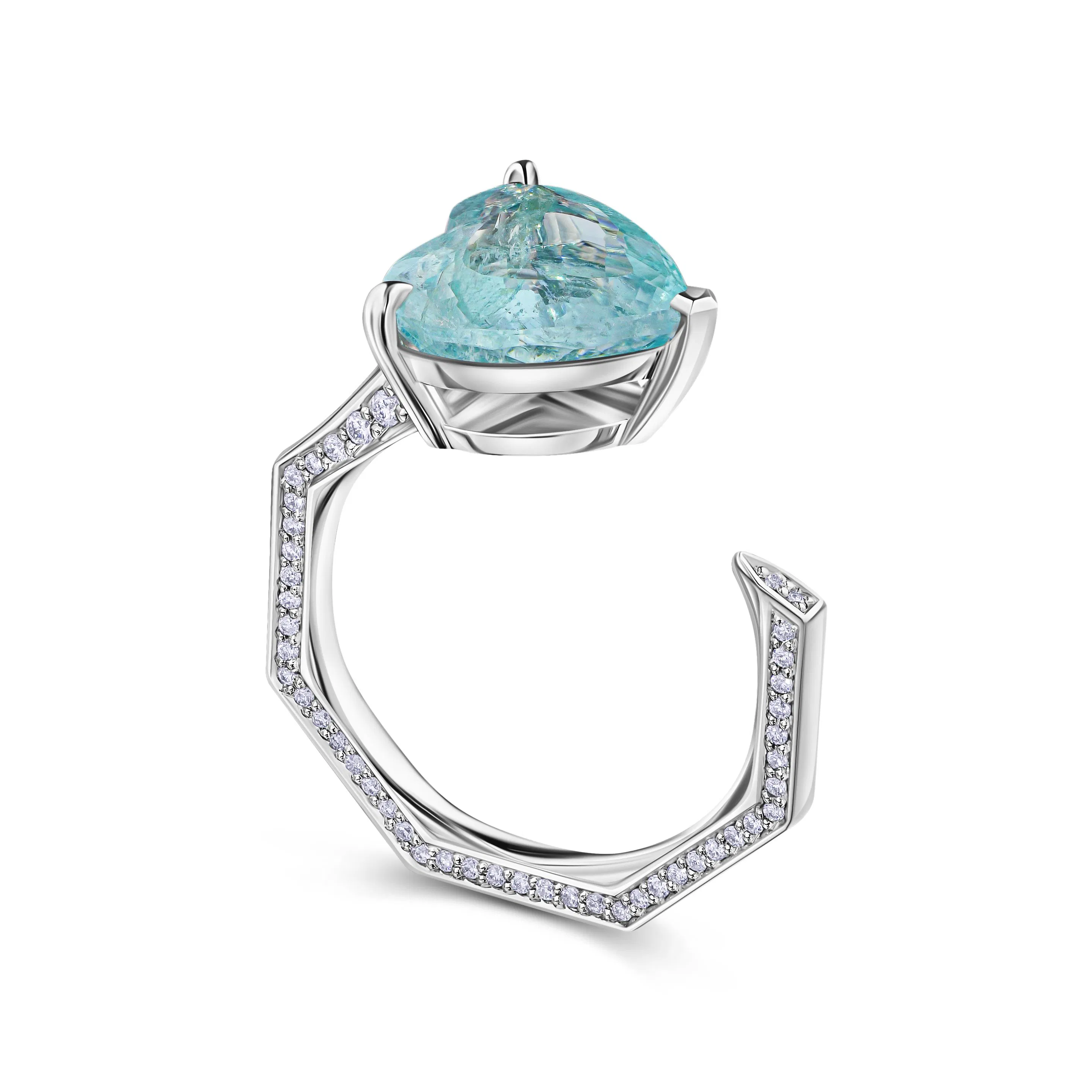 Кольцо с турмалином Параиба 3.51 карат привлекает внимание необычным оттенком центрального камня — ярким голубовато-зеленым турмалином, который отличается редкостью и насыщенностью цвета. Камень огранен в форме сердца, что придает украшению мягкость и выразительность. Белое золото служит надежной и лаконичной основой, подчеркивая чистоту и глубину оттенка турмалина. Дополнительным акцентом служат мелкие бриллианты, аккуратно инкрустированные в шейку кольца, создавая тонкий блеск и гармоничное завершение образа. Такое сочетание материалов и форм делает изделие универсальным для различных случаев, сохраняя при этом индивидуальность и стиль.