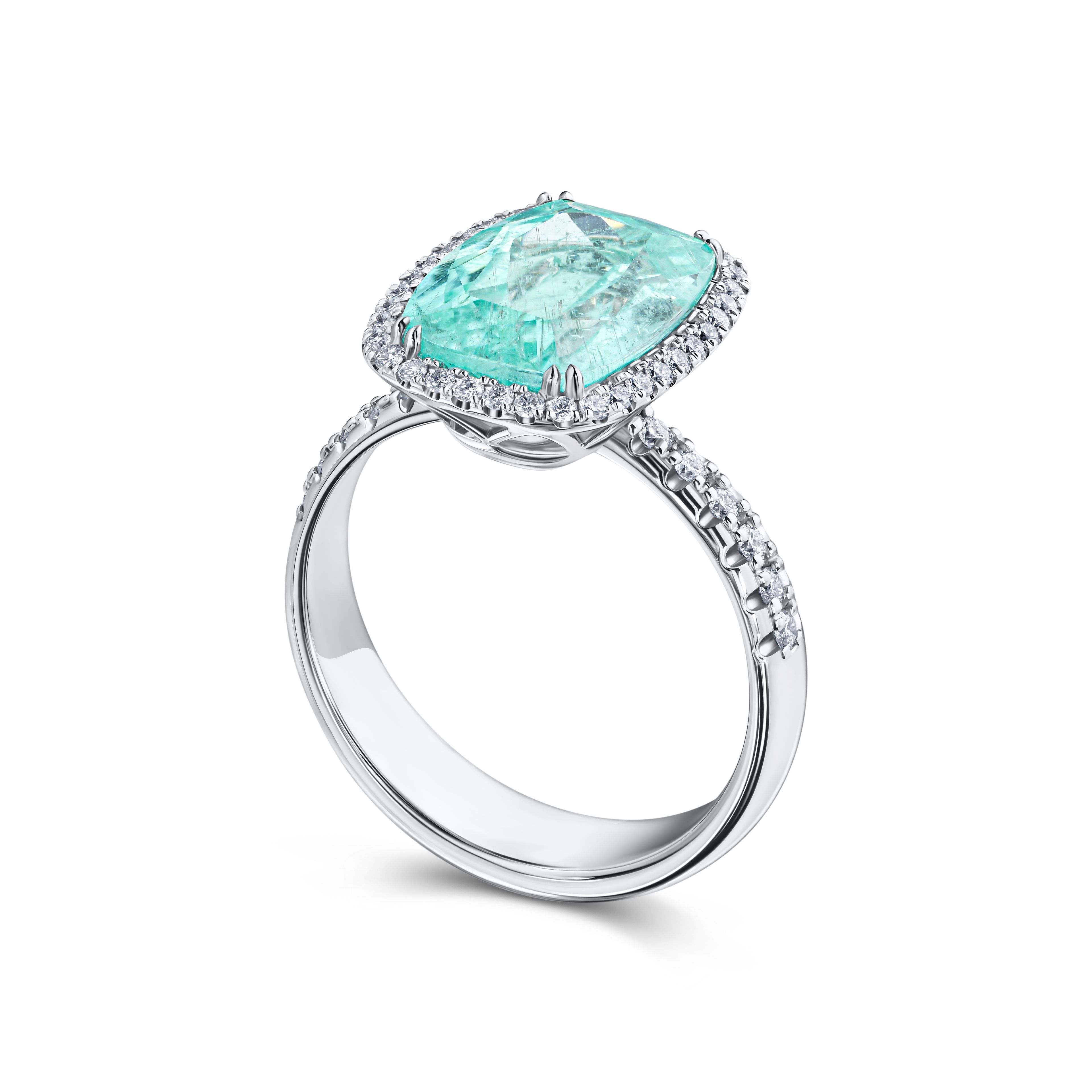 Кольцо с турмалином Параиба 3.86 карат — воплощение изысканности и утончённого стиля. Центральный камень пленяет своей уникальной игрой цвета, создавая ощущение глубины и загадочности. Обрамлённый сияющими бриллиантами, турмалин словно парит в облаке света, подчёркивая его природную красоту и уникальность.
