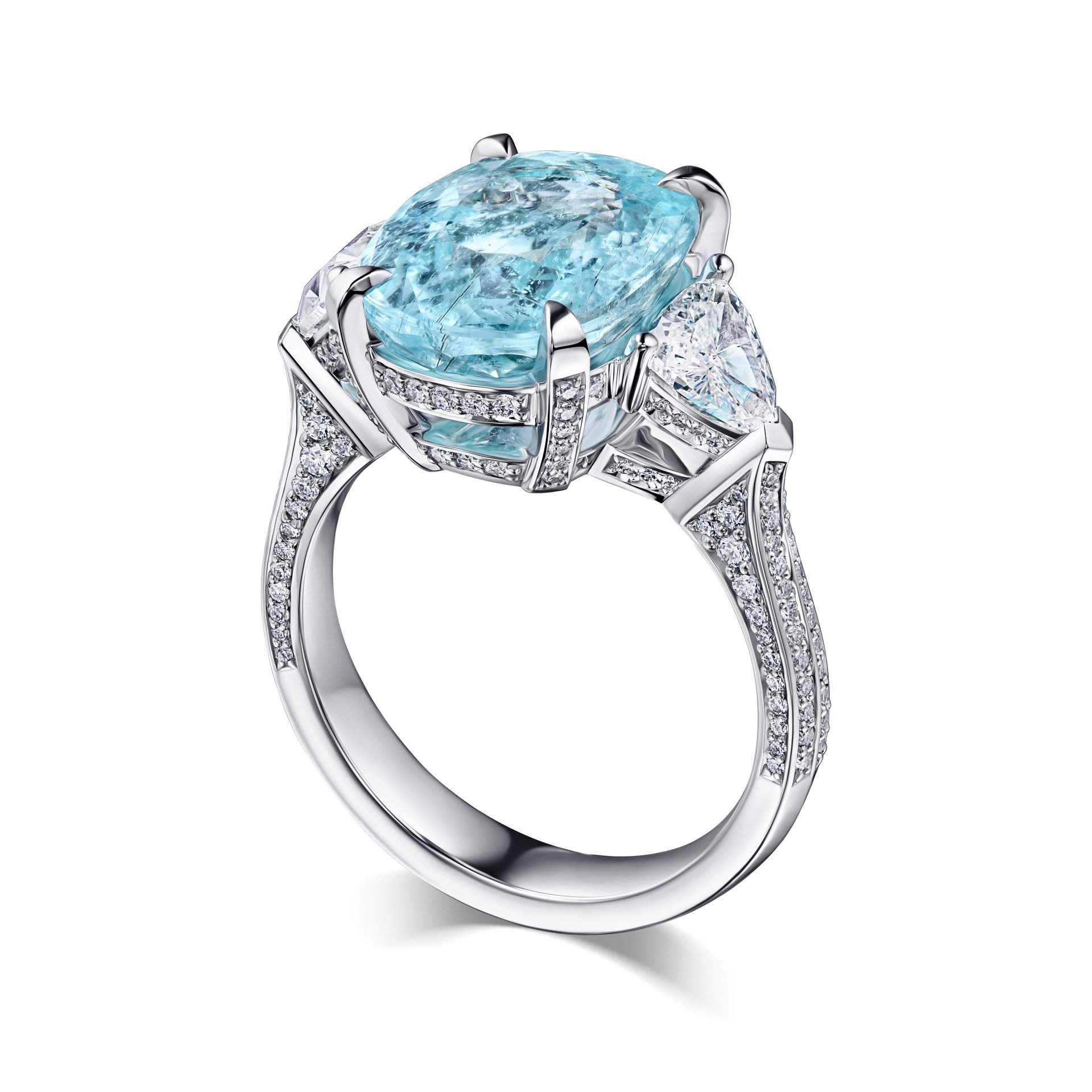 Кольцо с турмалином Параиба 5.41 карата привлекает внимание насыщенным голубым оттенком центрального камня, который отличается редкостью и выразительностью цвета. Турмалин Параиба весом 5.41 карата аккуратно закреплен в белом золоте, подчеркивая его прозрачность и глубину. По бокам расположены два триллионных камня, которые добавляют композиции дополнительный блеск и визуальный баланс, создавая гармоничное сочетание форм и оттенков. Изящная работа с металлом и точная огранка камней делают изделие заметным элементом любого образа. Это украшение — результат работы ювелирной дизайн-студии Parure Atelier, где внимание к деталям и качество исполнения стоят на первом месте.