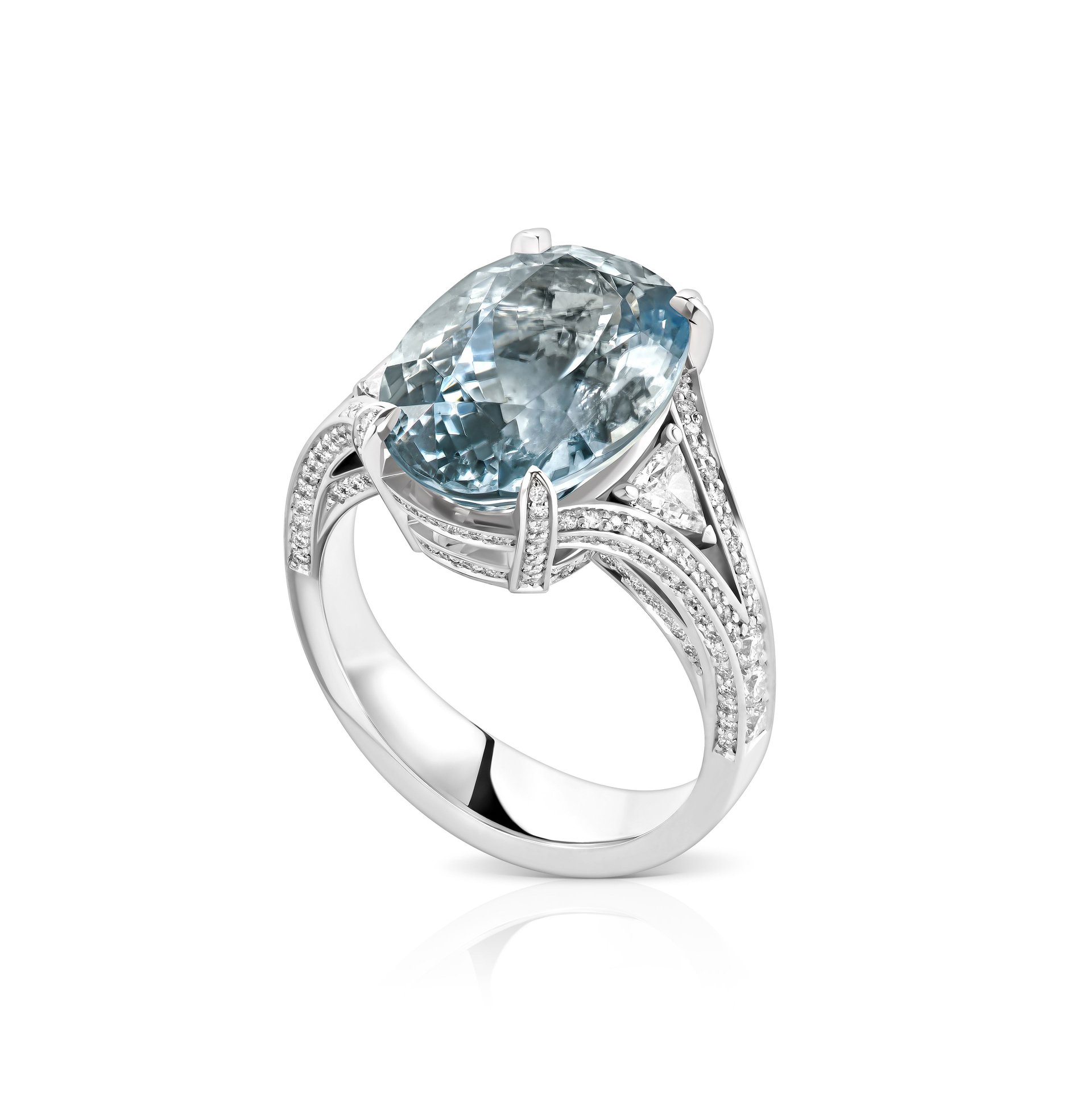 Изделие выполнено из белого золота 750 пробы, подчёркивающего насыщенность цвета турмалина. Боковые бриллианты общим весом 0.745 карат, с огранками «круг» и «треугольник», добавляют утонченное сияние и объем композиции, создавая сложную игру света. Мягкие линии дизайна обрамляют центральный камень, подчёркивая его природную красоту и придавая кольцу завершённый облик.