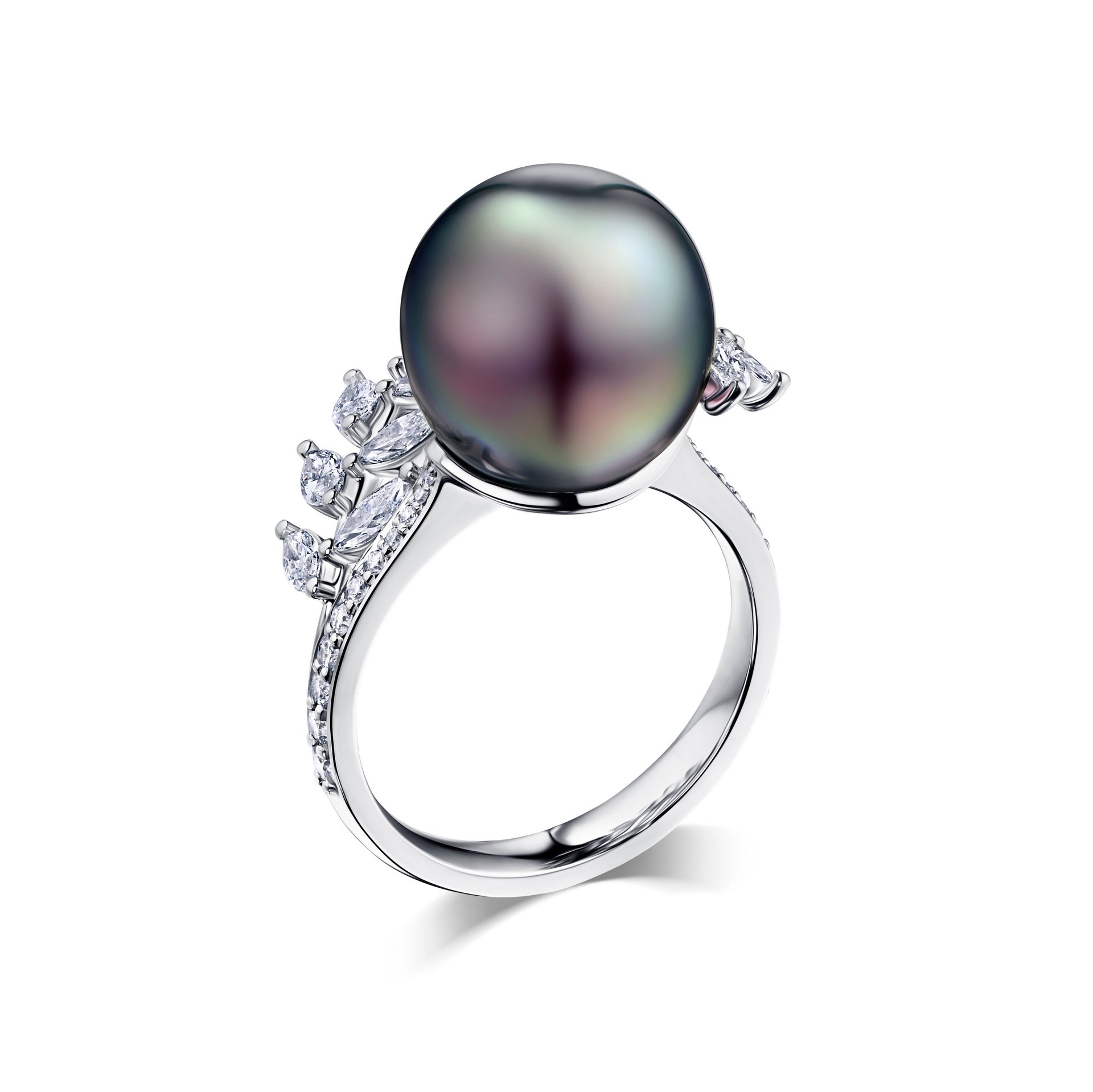 Кольцо с черным жемчугом 12.33 карата привлекает внимание своей выразительной центральной деталью — крупным жемчугом насыщенного темного оттенка с легкими переливами, создающими эффект глубины и загадочности. Окружают его изящные элементы в виде удлиненных бриллиантов, которые органично дополняют композицию, придавая украшению воздушность и тонкость. Каждая грань бриллиантов тщательно обработана, что усиливает игру света и подчеркивает благородство белого золота, выбранного для основы изделия.