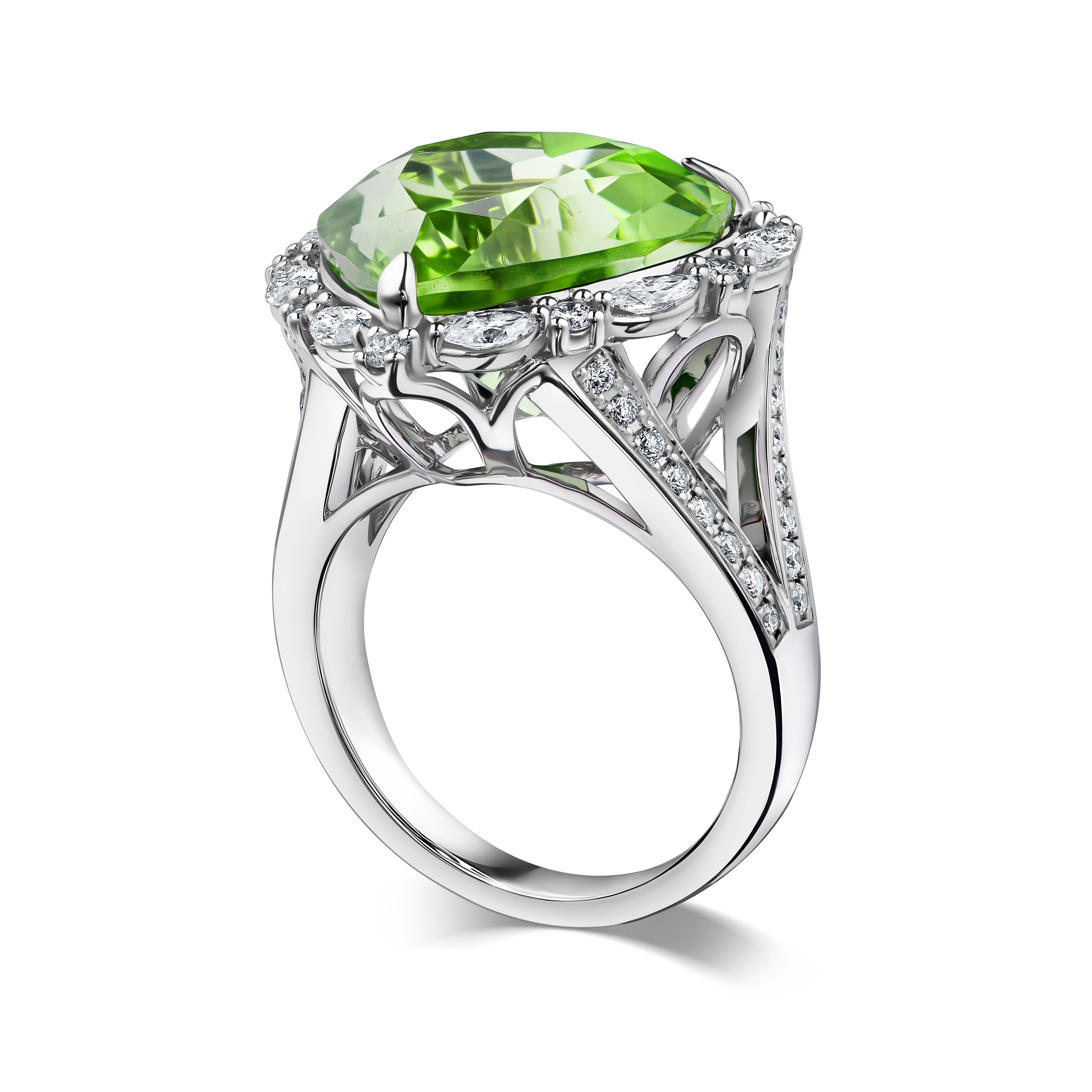 Кольцо с перидотом 13.01 карат привлекает внимание своей выразительной формой и насыщенным зелёным оттенком центрального камня. Перидот, огранённый в форме сердца, занимает центральное место, подчёркивая уникальность дизайна. Окружение из белого золота украшено рядом мелких бриллиантов овальной и круглой огранки, которые гармонично обрамляют основной камень, создавая эффект сияния и дополнительного объёма. Такое сочетание придаёт изделию лёгкость и изящность, сохраняя при этом выразительность.