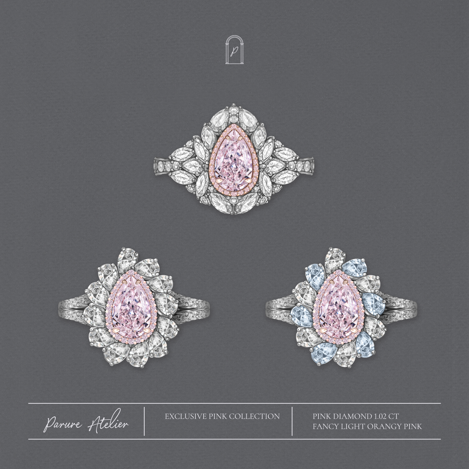 Фантазийный розовый бриллиант с оранжевым оттенком. Подобные бриллианты появляются на международном рынке 1-3 раза в год, в среднем на каждый такой экземпляр приходится 1 000 000 обычных бриллиантов.
