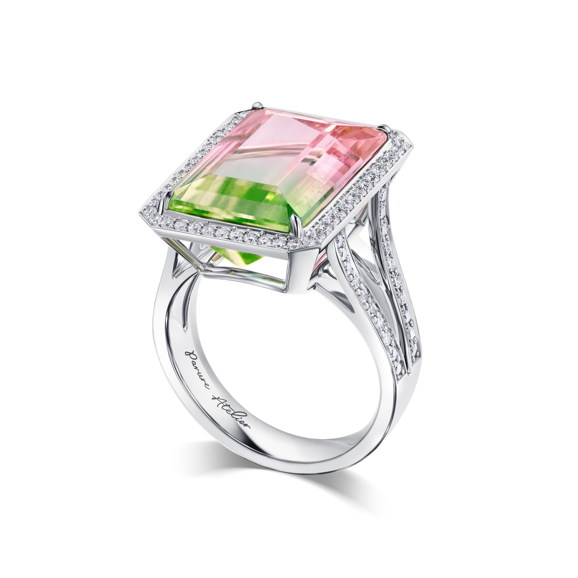 Кольцо с полихромным турмалином 9.05 карат — это истинное воплощение природной гармонии и изысканного дизайна. Центральный камень, турмалин, впечатляет своей палитрой, плавно переходящей от нежно-розового к ярко-зеленому. Такое сочетание оттенков создает эффект акварельной картины, привлекая внимание своей уникальностью и глубиной.