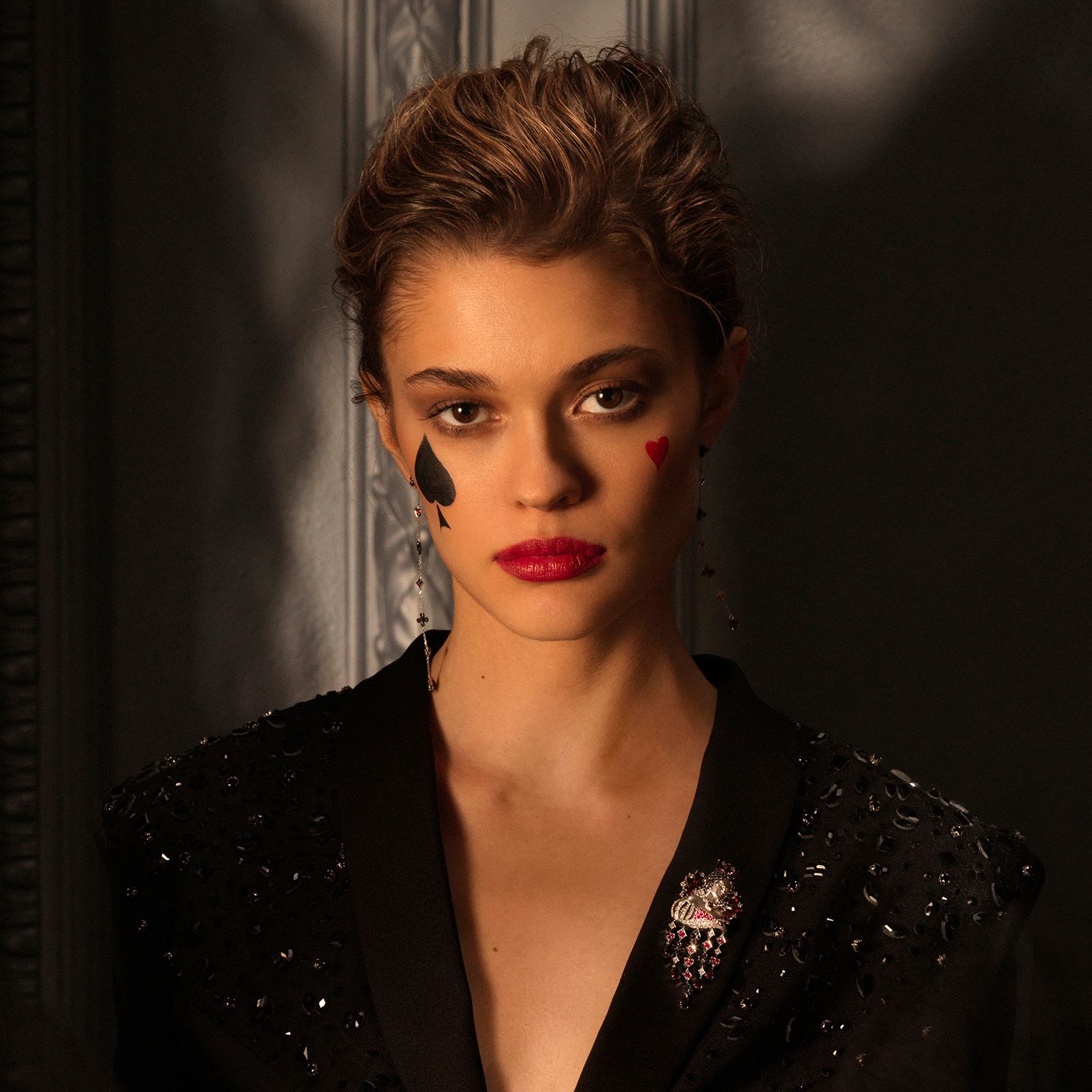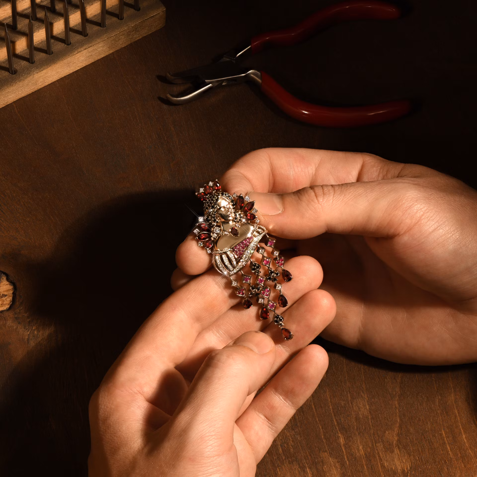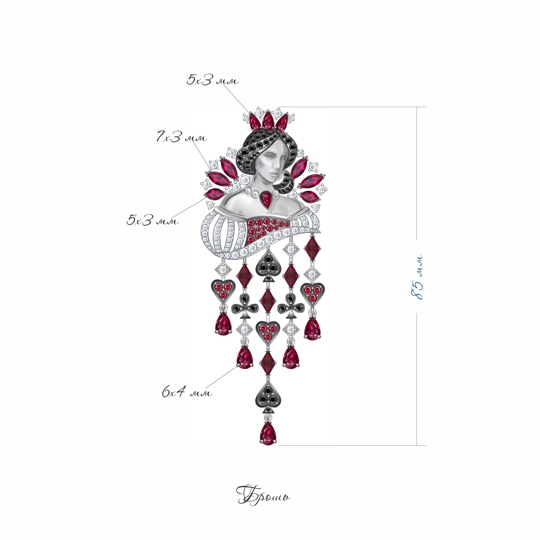 Брошь «Пиковая дама» выполнена из белого золота и украшена сочетанием бриллиантов, рубинов и гранатов общим весом 3.943 карата. Центральный элемент — изящный профиль дамы, украшенный каплевидным рубином на груди и окружённый гранатами, которые создают эффект короны и подчеркивают линию причёски. Акцентные бриллианты добавляют мягкий блеск и контрастируют с насыщенными оттенками красных камней. Нижняя часть украшения оформлена подвесками в виде мастей карт — пиков, червей, бубен и треф, инкрустированных мелкими рубинами и черными гранатами, что придаёт броши динамичность и оригинальность.