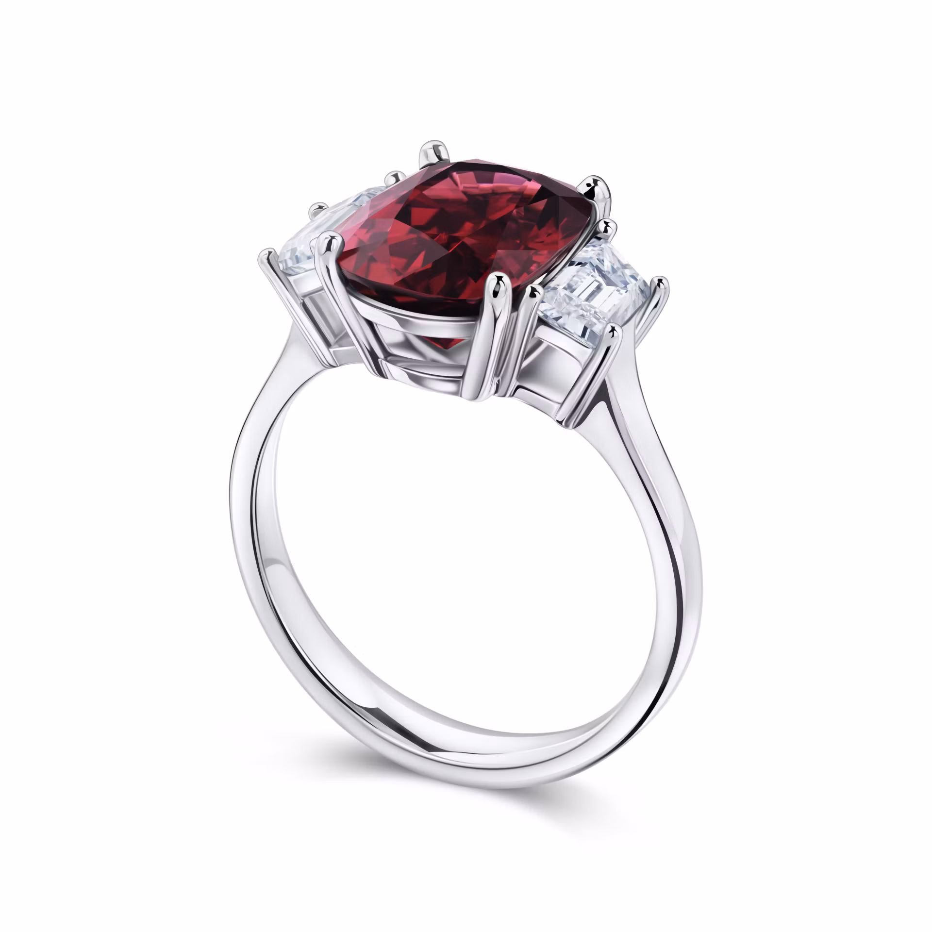 Великолепие этого кольца раскрывается через центральный гранат родолит весом 4.07 карата, который притягивает взгляд насыщенной красотой и глубиной цвета. Его овальная форма элегантно подчеркивается двумя бриллиантами трапециевидной огранки, общий вес которых составляет 0.78 карата. Эти боковые камни добавляют композиции утонченную симметрию и блеск, создавая гармоничный ансамбль.