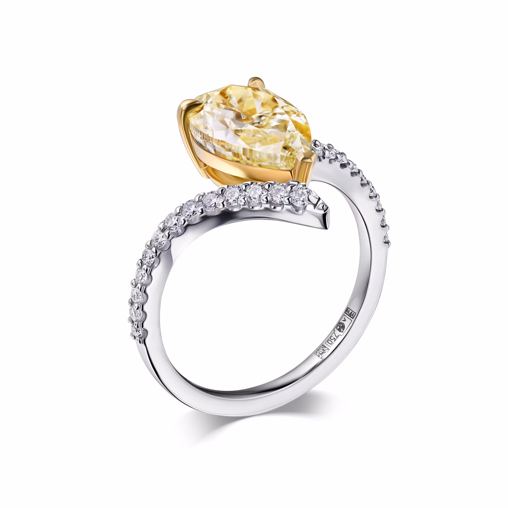 Кольцо с желтым бриллиантом 3.01 карата привлекает внимание своей необычной формой центрального камня — каплевидным желтым бриллиантом весом 3.01 карата. Его выразительный оттенок выгодно контрастирует с белым золотом, подчеркивая природную красоту камня. Вокруг основного элемента аккуратно расположены мелкие прозрачные бриллианты, которые плавно обрамляют центральный камень, создавая эффект легкости и изящества.