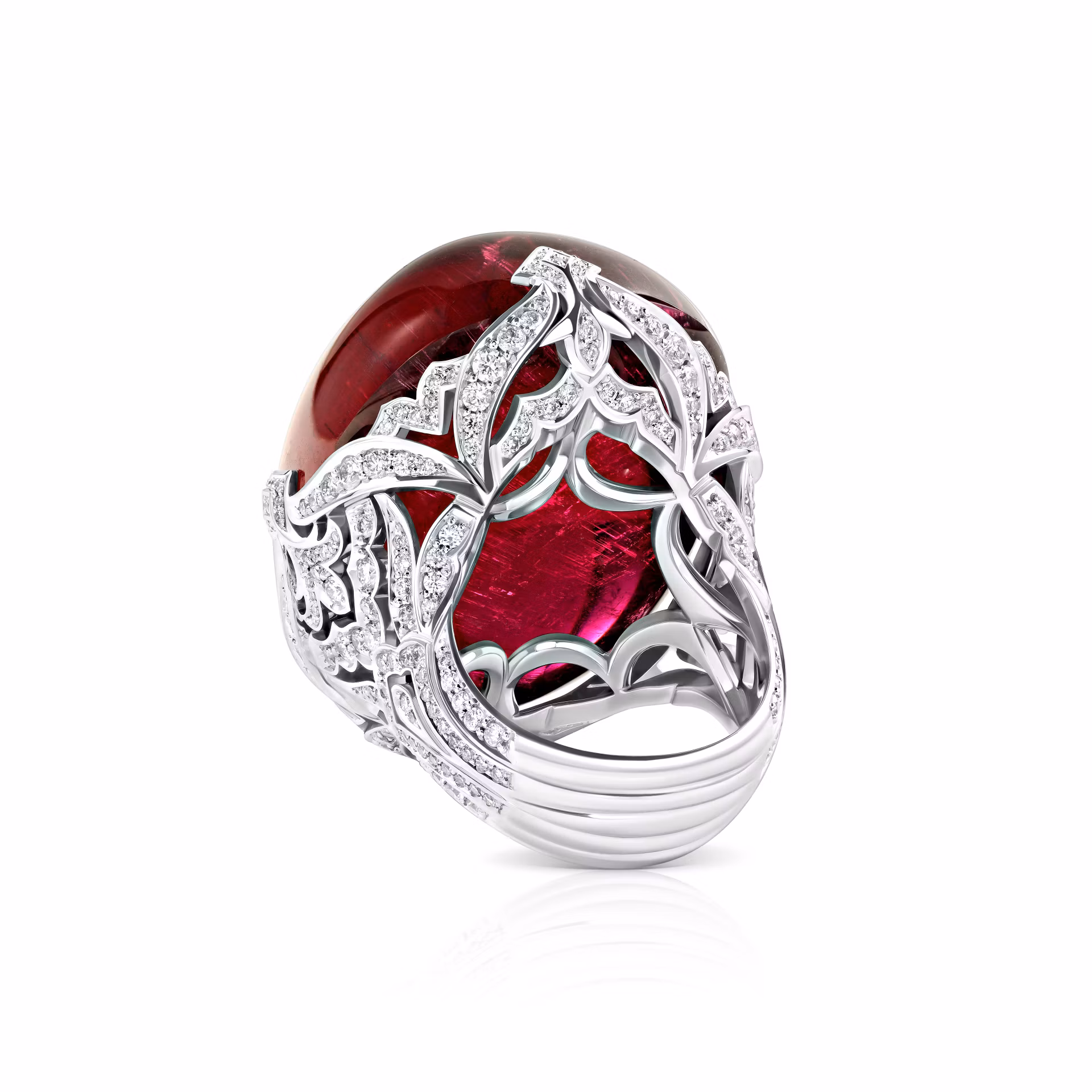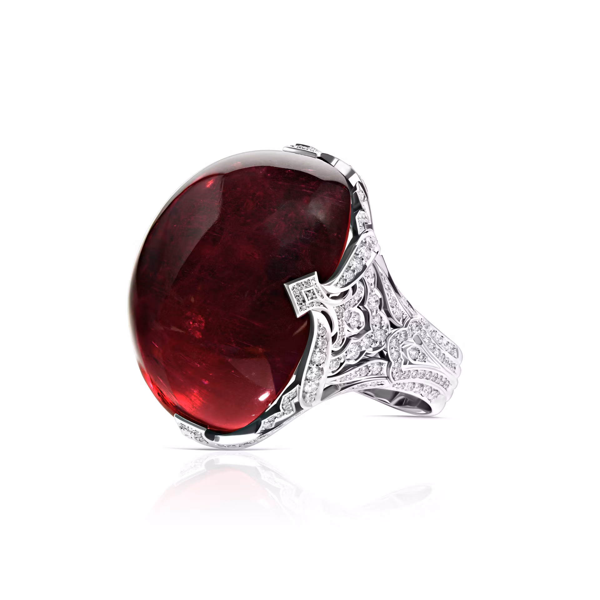 Артикул: R3761-1«Alchemy of Feelings» — это воплощение страсти и утончённости, выраженное в кольце с впечатляющим рубеллитом весом 110.18 карата. Его насыщенный красный оттенок завораживает, словно пламя, заключённое в изящной оправе из белого золота. Великолепие центрального камня подчёркнуто блистающими бриллиантами, огранёнными в классическую круглую форму, их общий вес составляет около 1.544 карата. Эти кристаллы добавляют композиции сияние и глубину, создавая гармоничный ансамбль.