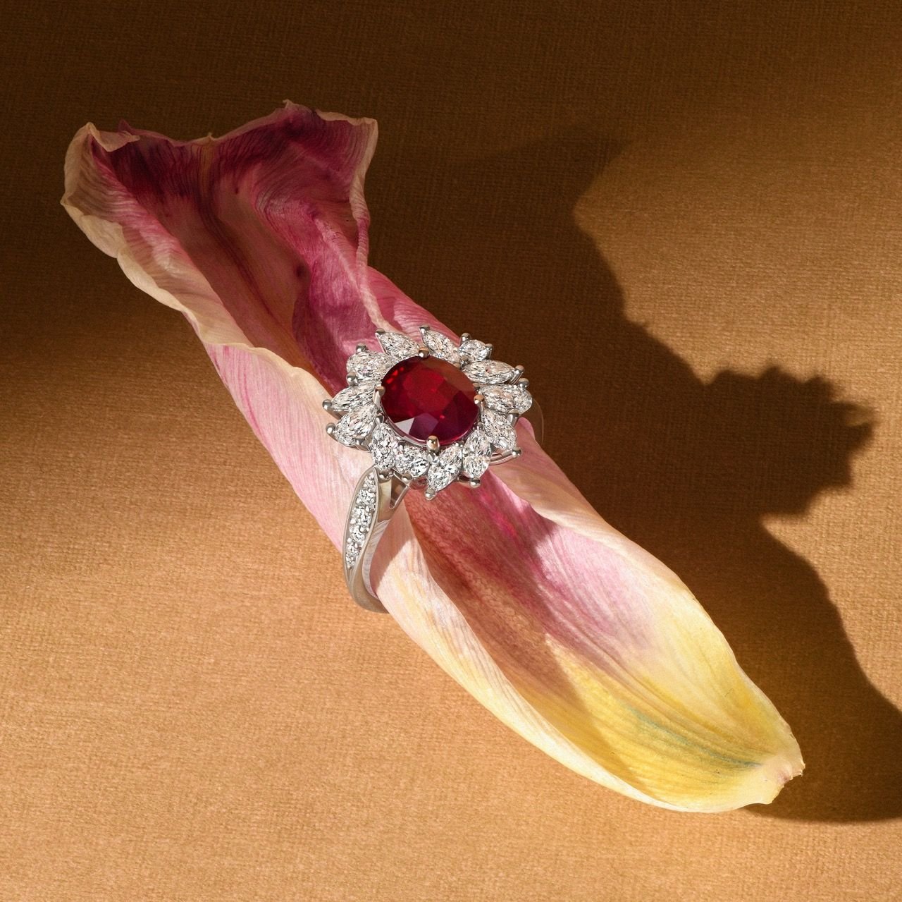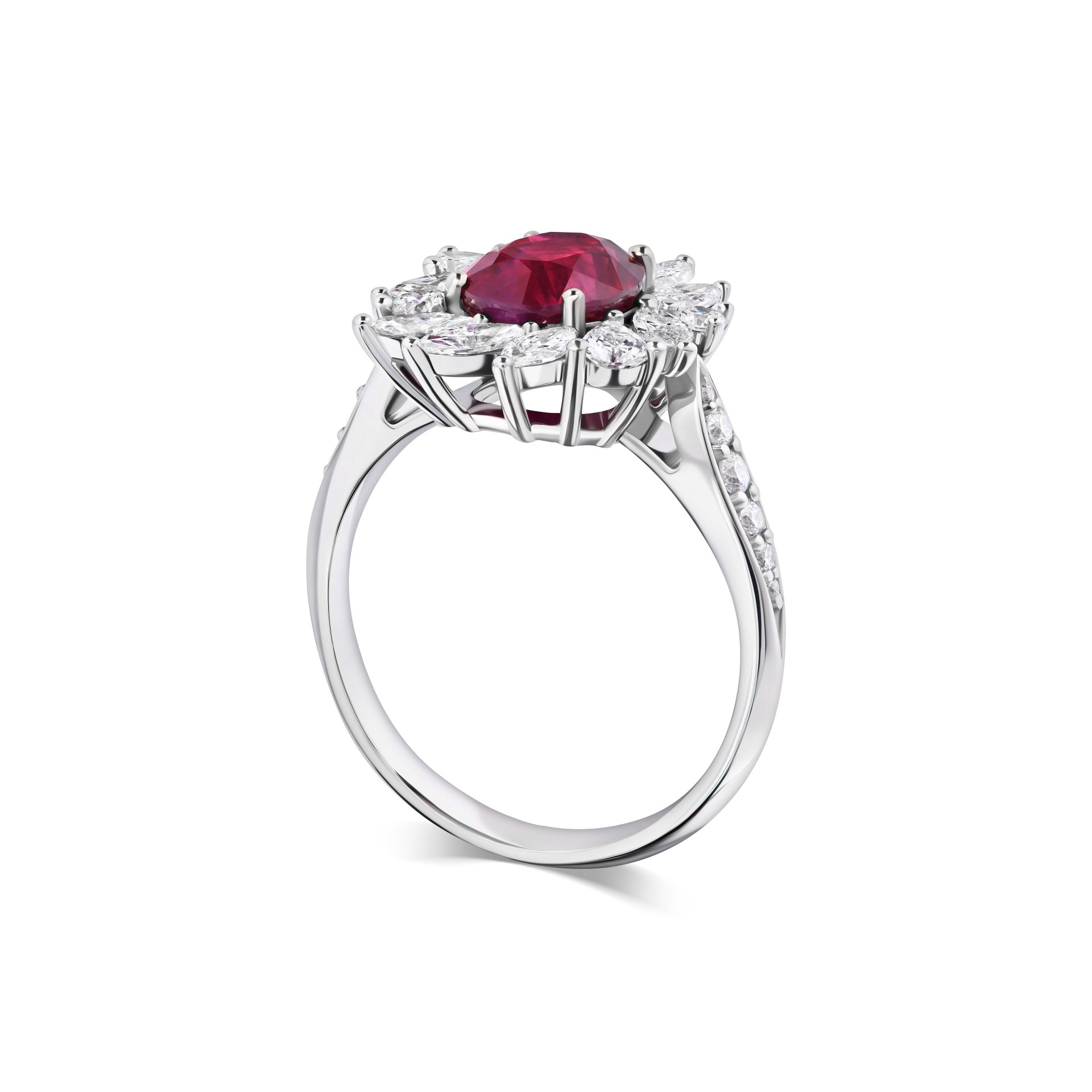 Изысканное кольцо с рубином 2.17 карат от ювелирной дизайн-студии Parure Atelier – это воплощение элегантности и утончённости. Центральный овальный рубин весом 2.17 карат обрамлен великолепными бриллиантами общей массой 1.014 карат. В дизайне использованы бриллианты разной огранки: маркиз, груша и круг, что придаёт изделию особый шарм и блеск. Белое золото 750 пробы подчёркивает насыщенный цвет рубина и сияние бриллиантов. Такое кольцо станет достойным украшением для любого торжественного события или идеальным подарком для особого человека. Позвольте себе роскошь и изящество с нашим эксклюзивным ювелирным изделием.