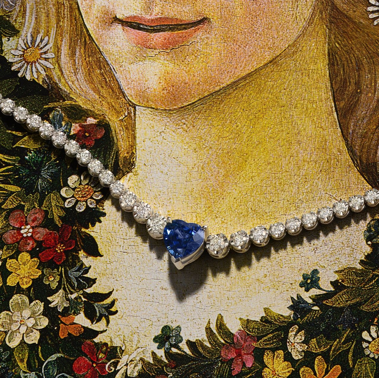 Украшение выполнено из белого золота, которое подчёркивает блеск бриллиантов и насыщенный цвет сапфира. Теннисное плетение делает колье универсальным аксессуаром, подходящим для различных образов.