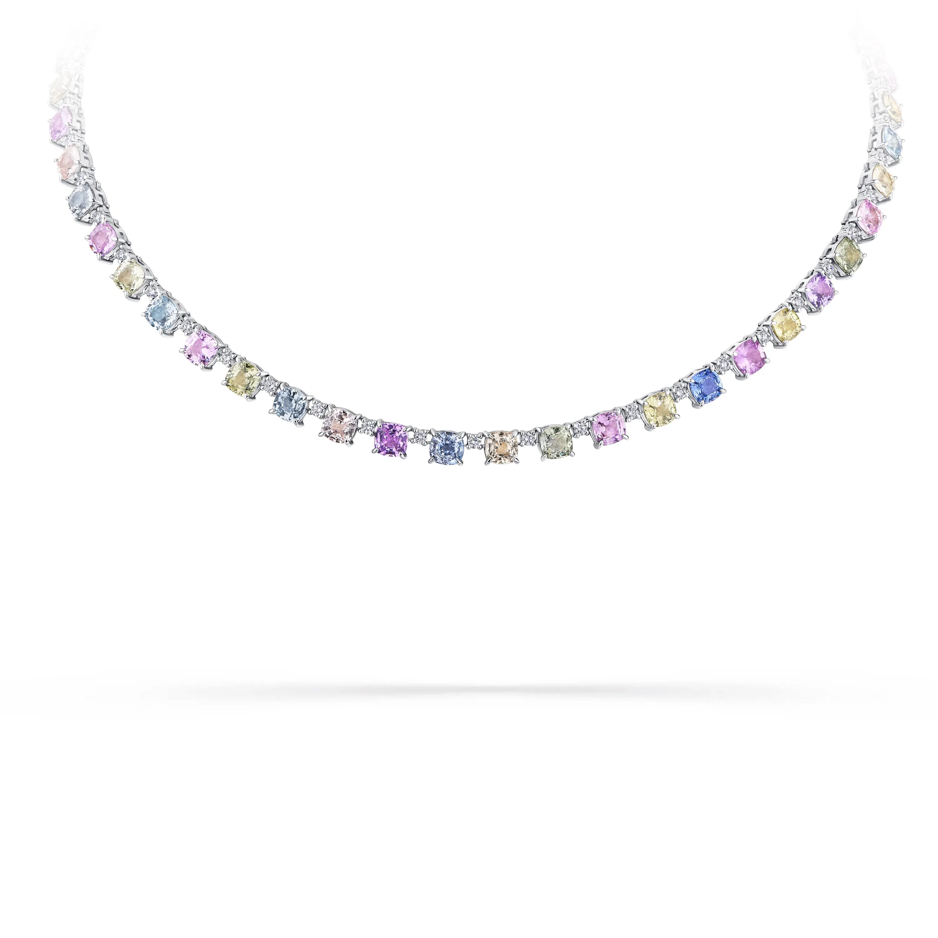 Колье с сапфирами 46.17 карата представляет собой гармоничное сочетание белого золота и множества квадратных сапфиров разнообразных оттенков. Центральный камень весом 46.17 карата образует основу украшения, а его насыщенный цвет подчеркивается рядом дополнительных сапфиров, которые создают плавный переход тонов от нежно-голубого до глубокого фиолетового. Такой дизайн обеспечивает равномерное распределение света, придавая изделию особую глубину и выразительность.