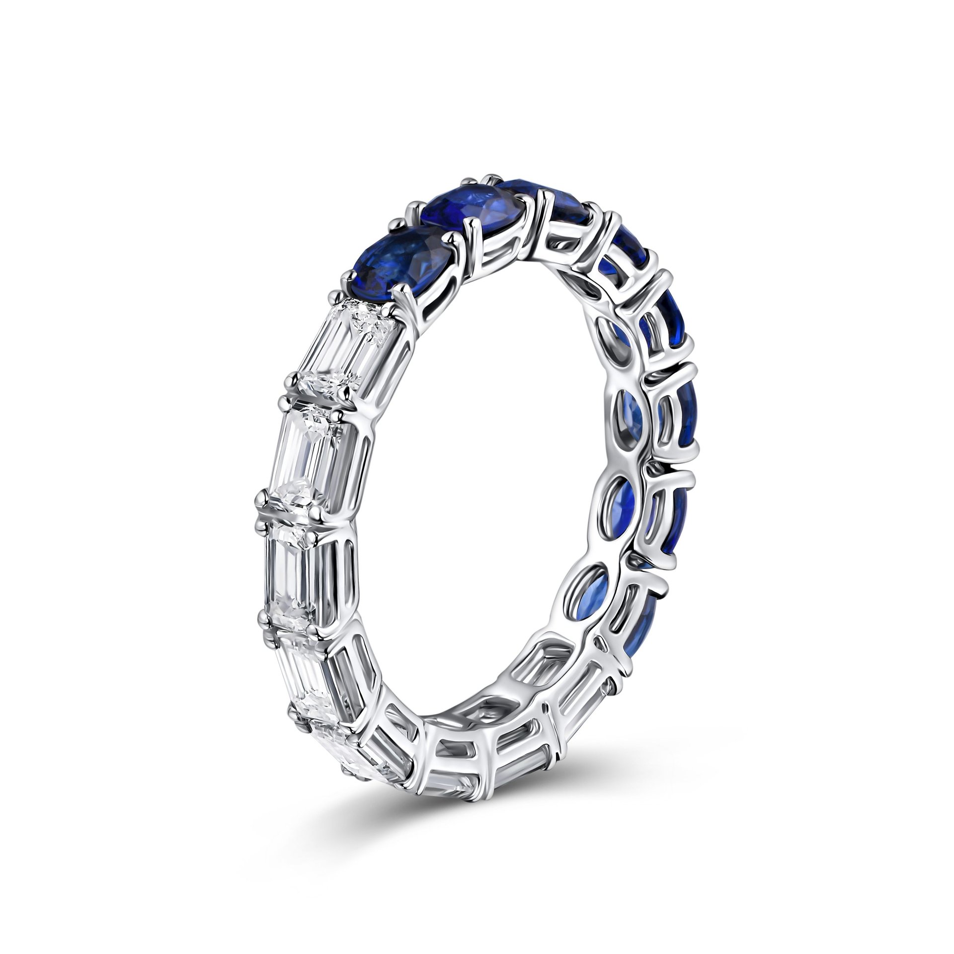 Кольцо-дорожка с сапфирами 1.84 карата — это воплощение гармонии и изысканности. Глубокий синий цвет сапфиров, весом 1.84 карата, создает чарующую симфонию с бриллиантами огранки «Эмеральд», которые добавляют около 1.53 карата блеска. Их сияние усиливает элегантность белого золота, подчеркивая утонченный дизайн кольца.