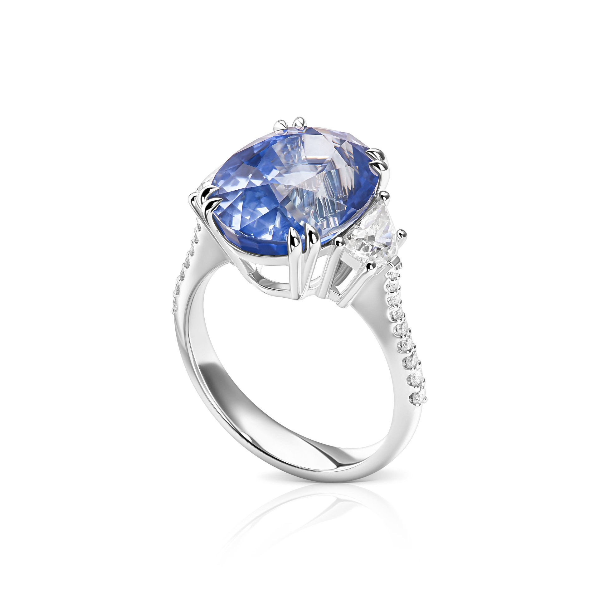 Элегантное кольцо с овальным сапфиром Blue весом 10.22 карата, добытым на Шри-Ланке, создано в нашей ювелирной дизайн-студии Parure Atelier. Центральный камень закреплен в оправе из белого золота 750 пробы, которая подчеркивает его глубокий цвет и игру света. Боковые камни – бриллианты огранки халфмун, общий вес которых составляет 0.64 карата, гармонично дополняют композицию, добавляя изделию изысканного блеска.