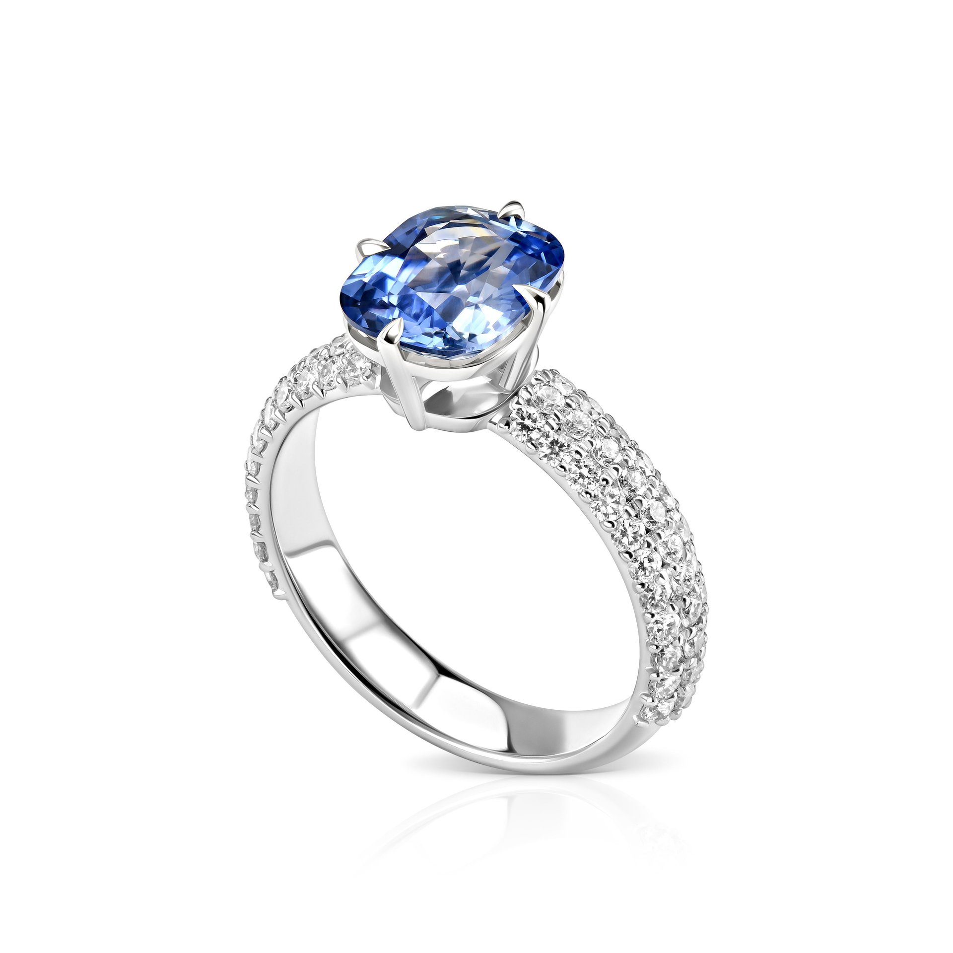 Кольцо с сапфиром 2.48 карат от ювелирной дизайн-студии Parure Atelier сочетает в себе благородные материалы и продуманную композицию. Центральный сапфир пастельно-голубого оттенка, добытый в Шри-Ланке, имеет огранку кушон, что подчеркивает его игру света. Камень закреплен в четырехкрапановом касте, который обеспечивает надежную фиксацию и подчеркивает его форму.