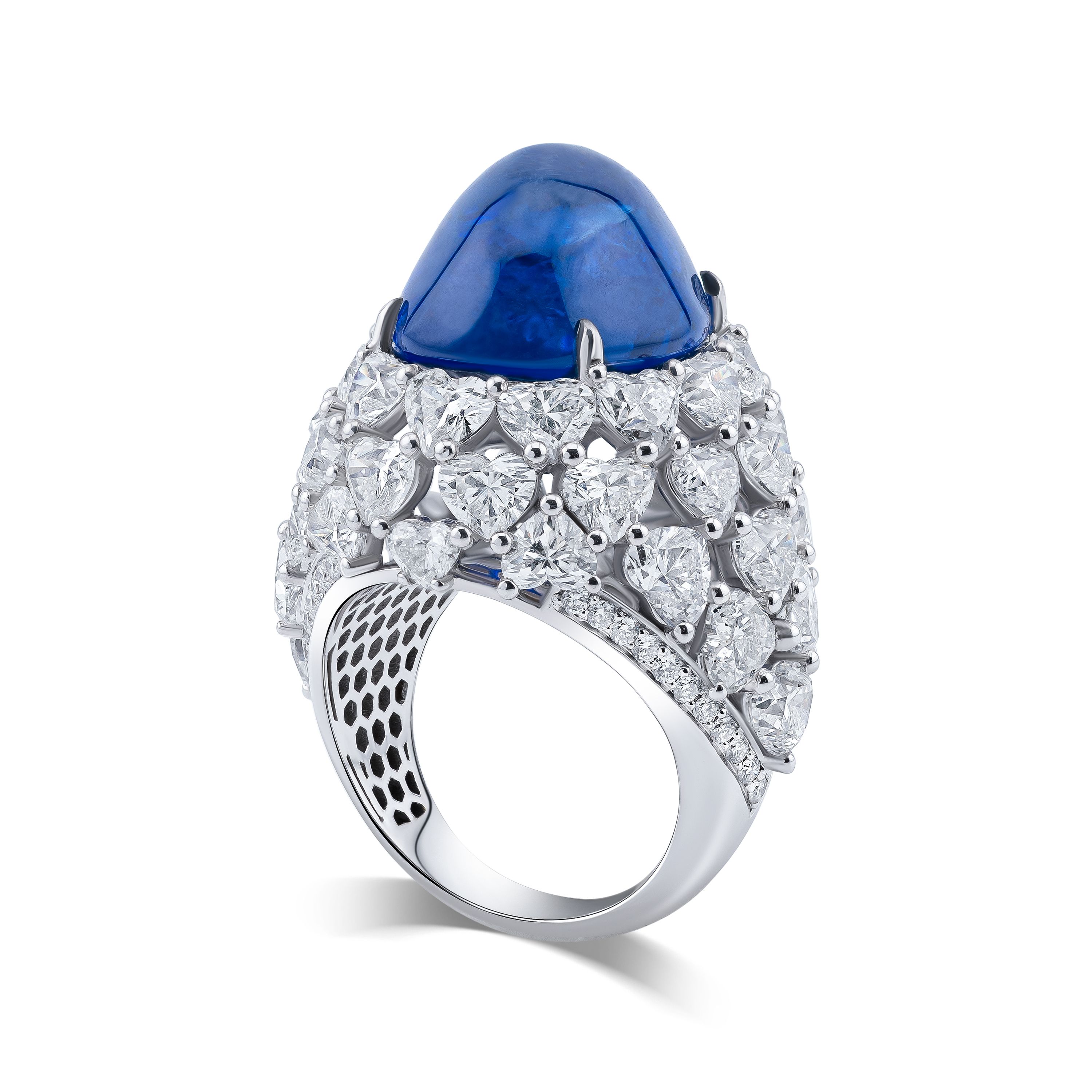 Погрузитесь в глубокий синий мир с кольцом, где центральный сапфир весом 22.49 карат становится главным героем. Его насыщенный цвет и гладкая поверхность создают впечатление безмятежности и тайны. Окружающие его бриллианты, общей массой около 11.13 карат, словно звезды, сияют вокруг, подчеркивая величие центрального камня. Их огранка в форме сердца и круга добавляет романтики и изысканности, создавая неповторимую игру света.