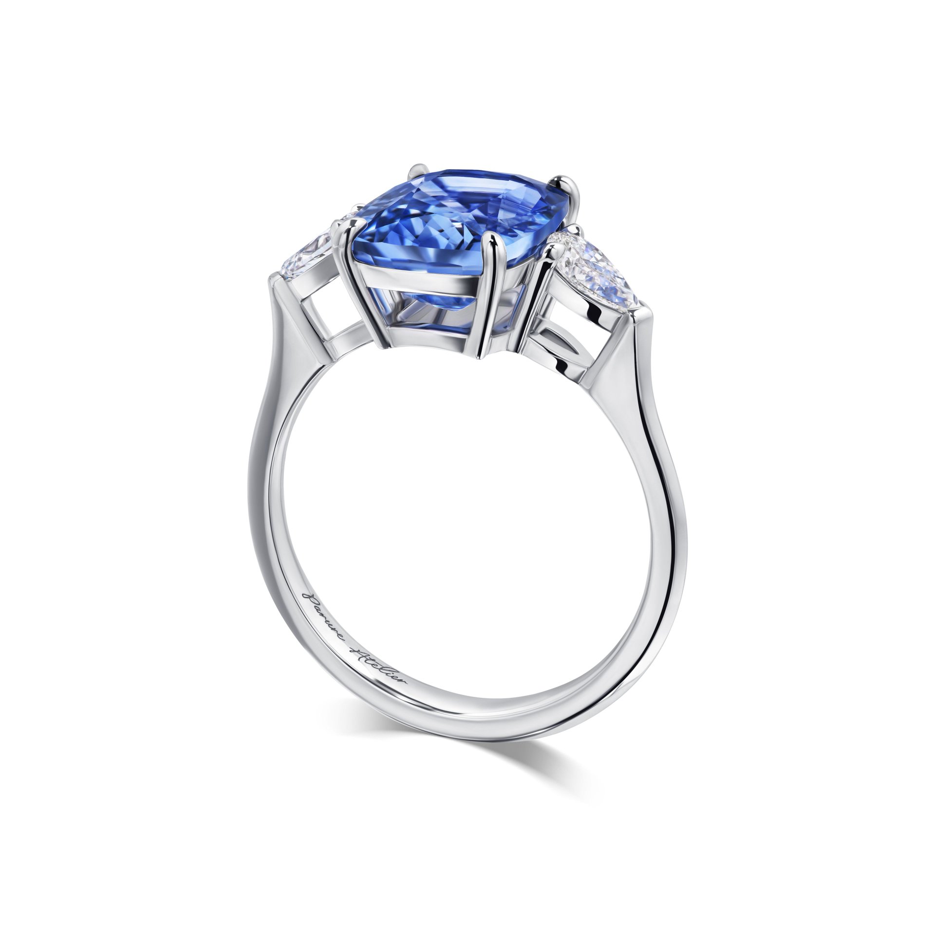 Это элегантное кольцо с сапфиром весом 3.86 карат создано из белого золота 750 пробы, подчеркивая исключительность природного камня. Центральный сапфир огранки кушон привлекает внимание насыщенным синим оттенком, а пара бриллиантов общим весом 0.39 карат в огранке груша гармонично дополняют композицию, добавляя украшению особый блеск и изысканность.