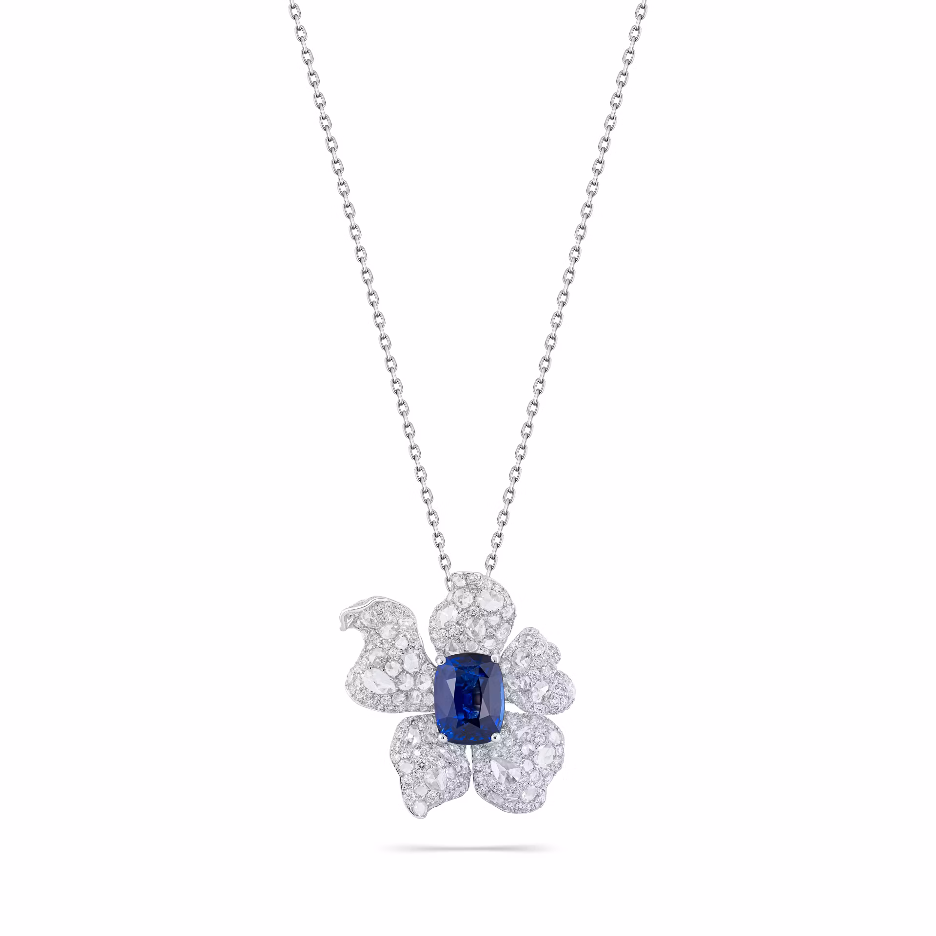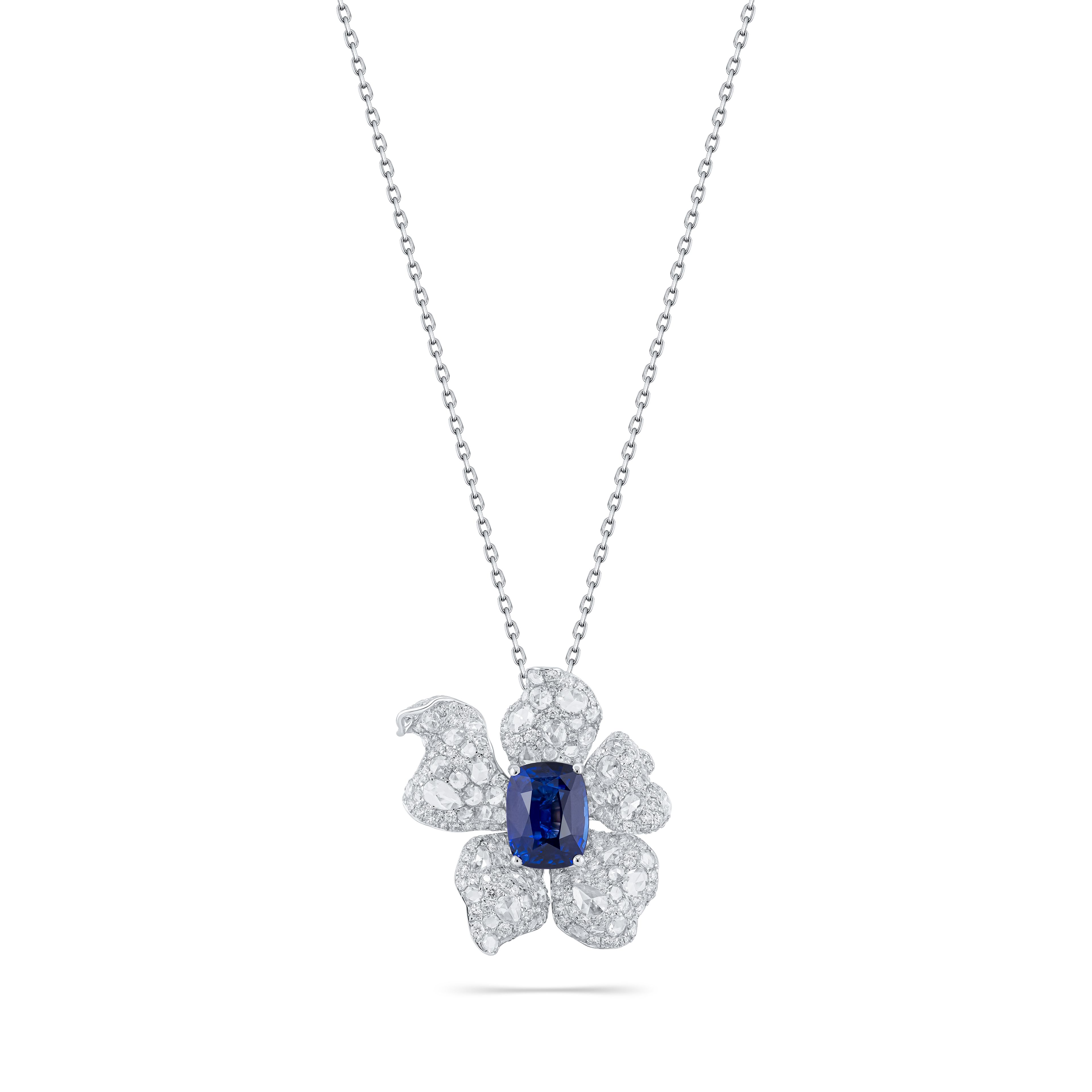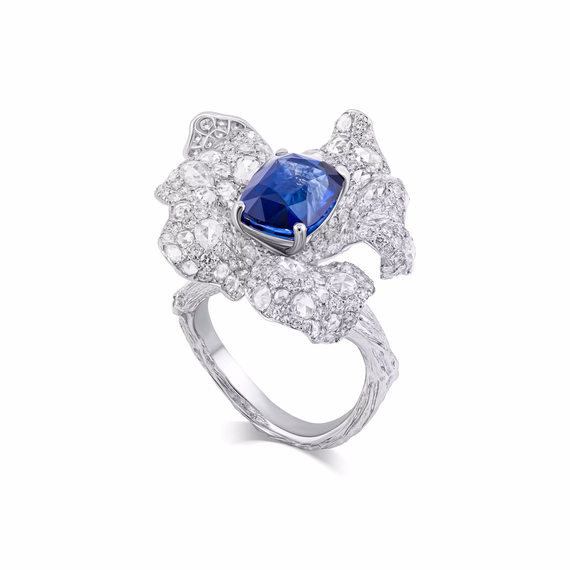 Кольцо-трансформер с сапфиром 5.24 карата привлекает внимание глубоким синим оттенком центрального камня. Сапфир весом 5.24 карата расположен в центре композиции, окружённой лепестками из белого золота, инкрустированными множеством мелких бриллиантов. Такая конструкция позволяет украшению изменять форму, что добавляет универсальности и функциональности в его носке. Белое золото подчёркивает насыщенность цвета сапфира и создаёт гармоничный контраст с прозрачными гранями бриллиантов.