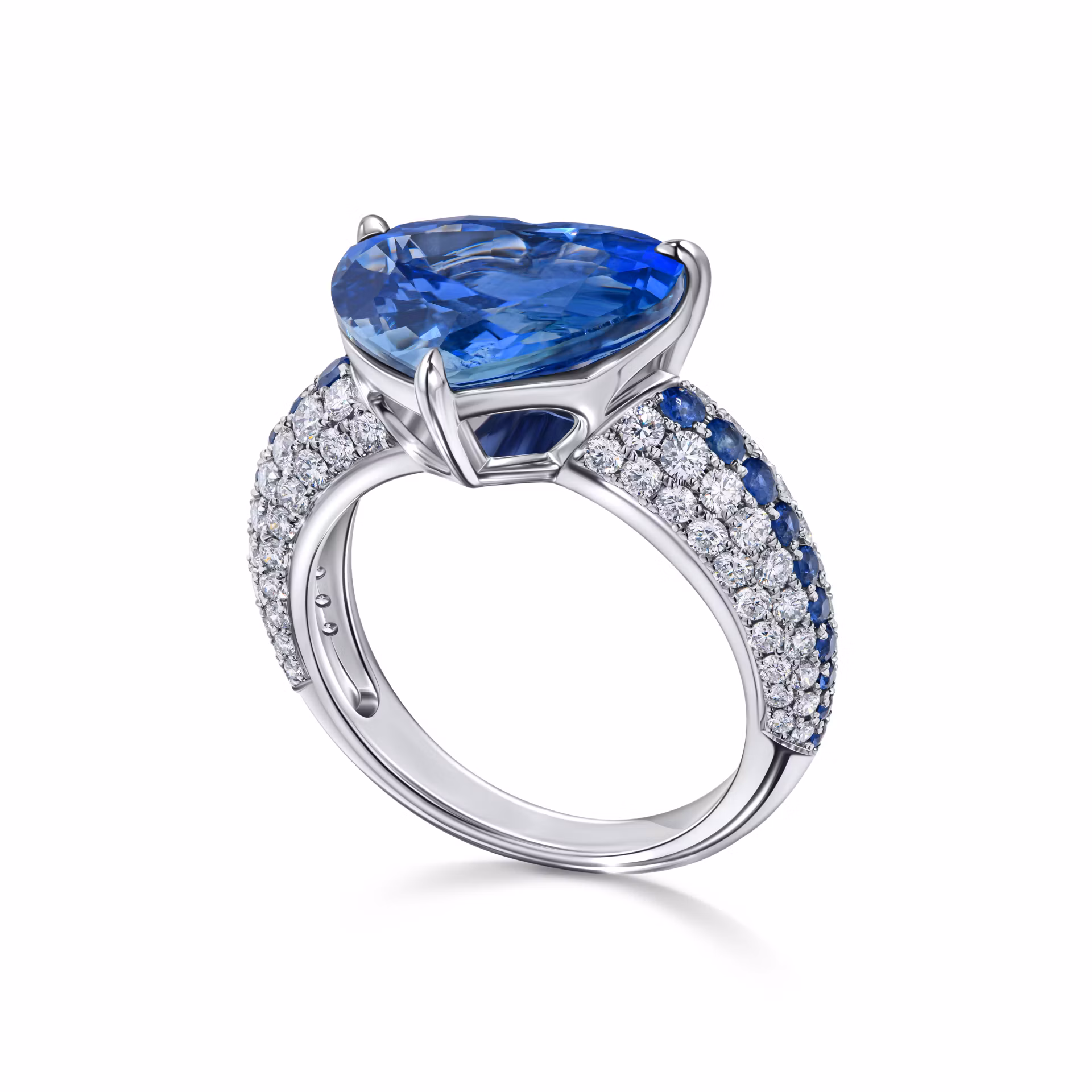 Боковые стороны кольца украшены россыпью из мелких бриллиантов, добавляющих изысканный блеск и подчеркивающих красоту сапфира. Этот гармоничный союз камней создает впечатление легкости и утонченности, которое идеально подходит для особых случаев и повседневного ношения.