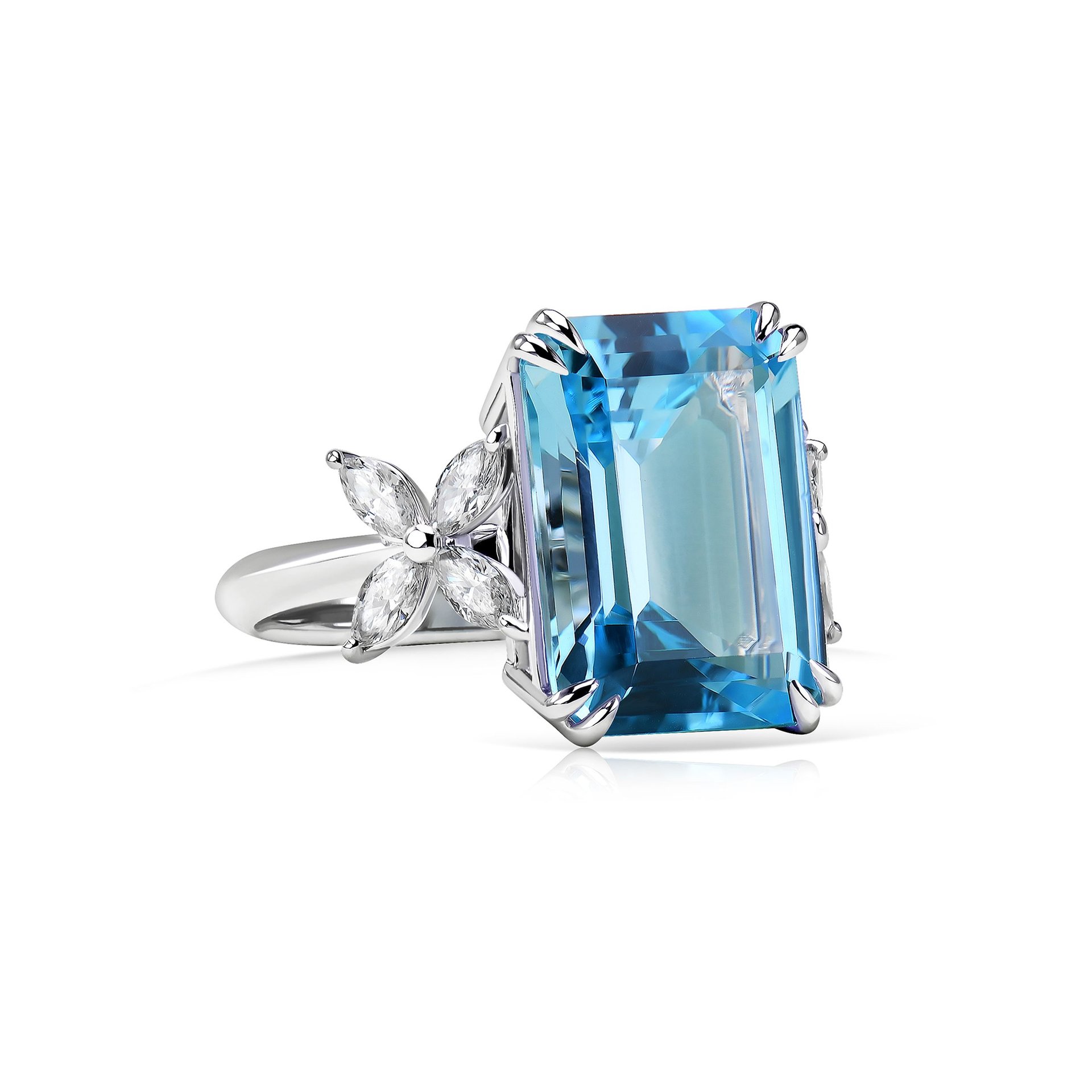 Великолепное кольцо, в центре которого сияет топаз весом 13.85 карат, станет настоящим украшением любой коллекции. Его насыщенный голубой оттенок напоминает о безмятежности морских глубин, привнося в образ свежесть и элегантность. По бокам центрального камня расположились бриллианты огранки маркиз, общим весом 0.506 карат. Они добавляют украшению утончённого блеска, создавая впечатление лёгкости и нежности.