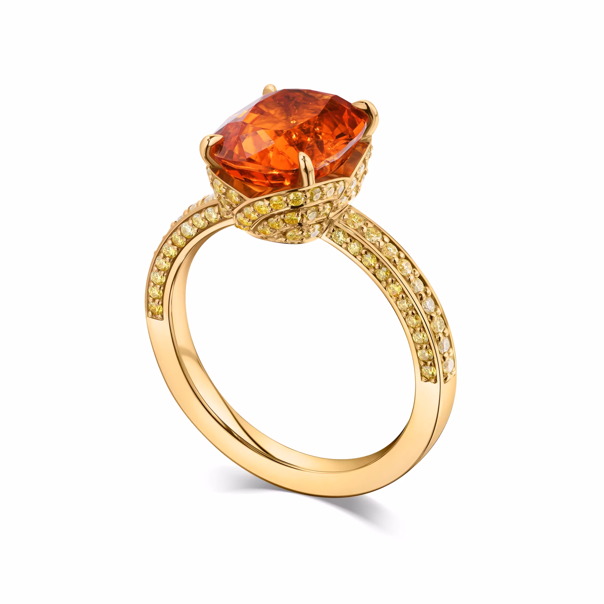 Кольцо "Golden Dream" воплощает в себе гармонию и изысканность. Центральный спессартин весом 4.52 карата завораживает своим насыщенным оранжевым оттенком, словно заключая в себе солнечный свет. Этот камень, обладающий природной теплотой, создает уникальный акцент, который невозможно не заметить.