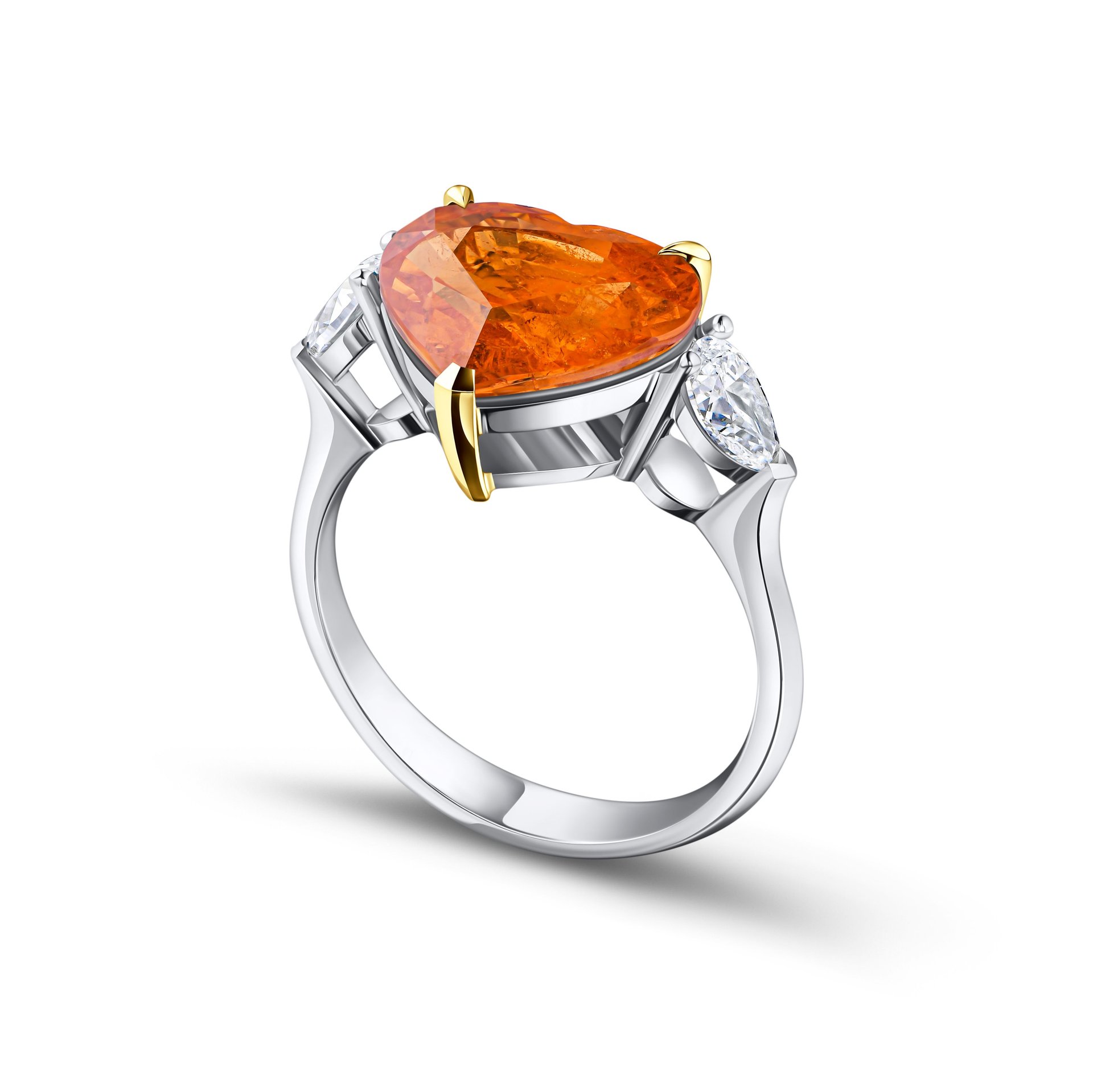 Кольцо со спессартином 5.50 карат представляет собой изящное сочетание выразительного центрального камня и аккуратных боковых деталей. Спессартин весом 5,5 карата выполнен в форме сердца, что подчеркивает его природную красоту и насыщенный оранжево-красный оттенок. Такой камень привлекает внимание своей глубиной цвета и уникальной текстурой, создавая эффект живого огня.