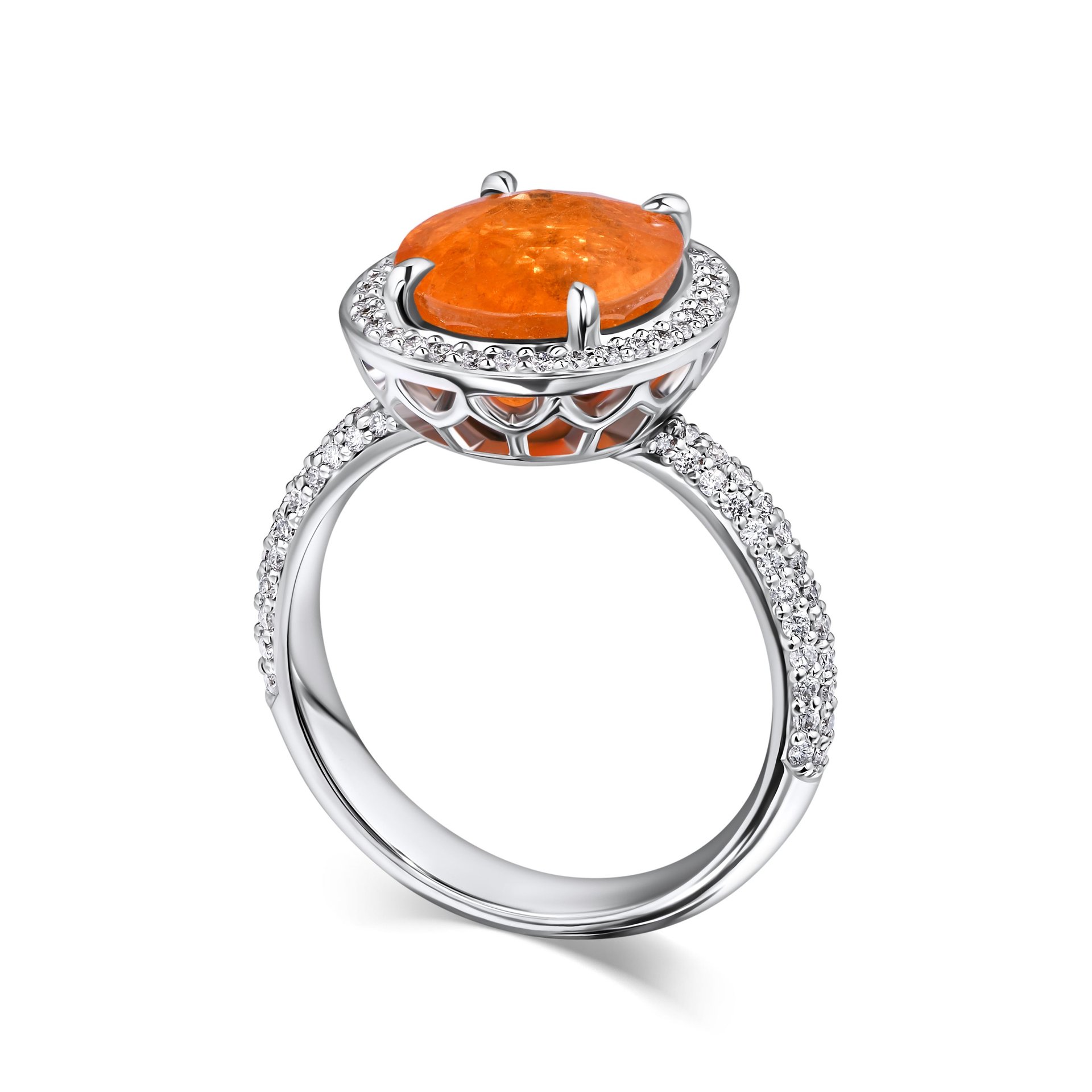 Кольцо со спессартином 6.10 карат привлекает внимание насыщенным оттенком центрального камня весом 6.1 карат. Спессартин, известный своей теплой оранжевой палитрой, гармонично сочетается с белым золотом, создавая выразительный контраст. Овальная огранка подчеркивает глубину цвета и естественную игру света, делая камень главным акцентом изделия. Вокруг спессартина аккуратно размещен ряд мелких бриллиантов, которые добавляют композиции изящности и дополнительного сияния. Тонкий ободок и филигранная работа на шейке кольца обеспечивают комфорт при носке и подчеркивают внимание к деталям. Это украшение от ювелирной дизайн-студии Parure Atelier станет достойным дополнением к любой коллекции, подчеркивая индивидуальность и вкус владельца.