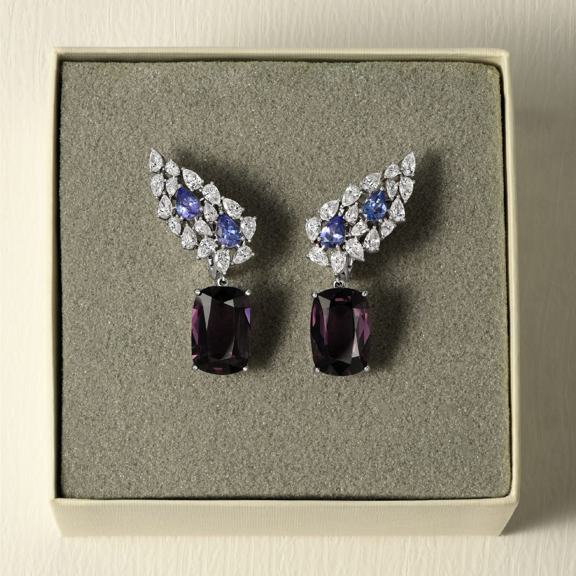 Изящная композиция дополнена россыпью бриллиантов, которые обрамляют шпинели, создавая эффектный контраст и усиливая их природное сияние. Вкрапления фиолетовых камней добавляют композиции нотки изысканности и благородства. Белое золото, использованное в качестве основы, придаёт украшению современный и стильный вид.