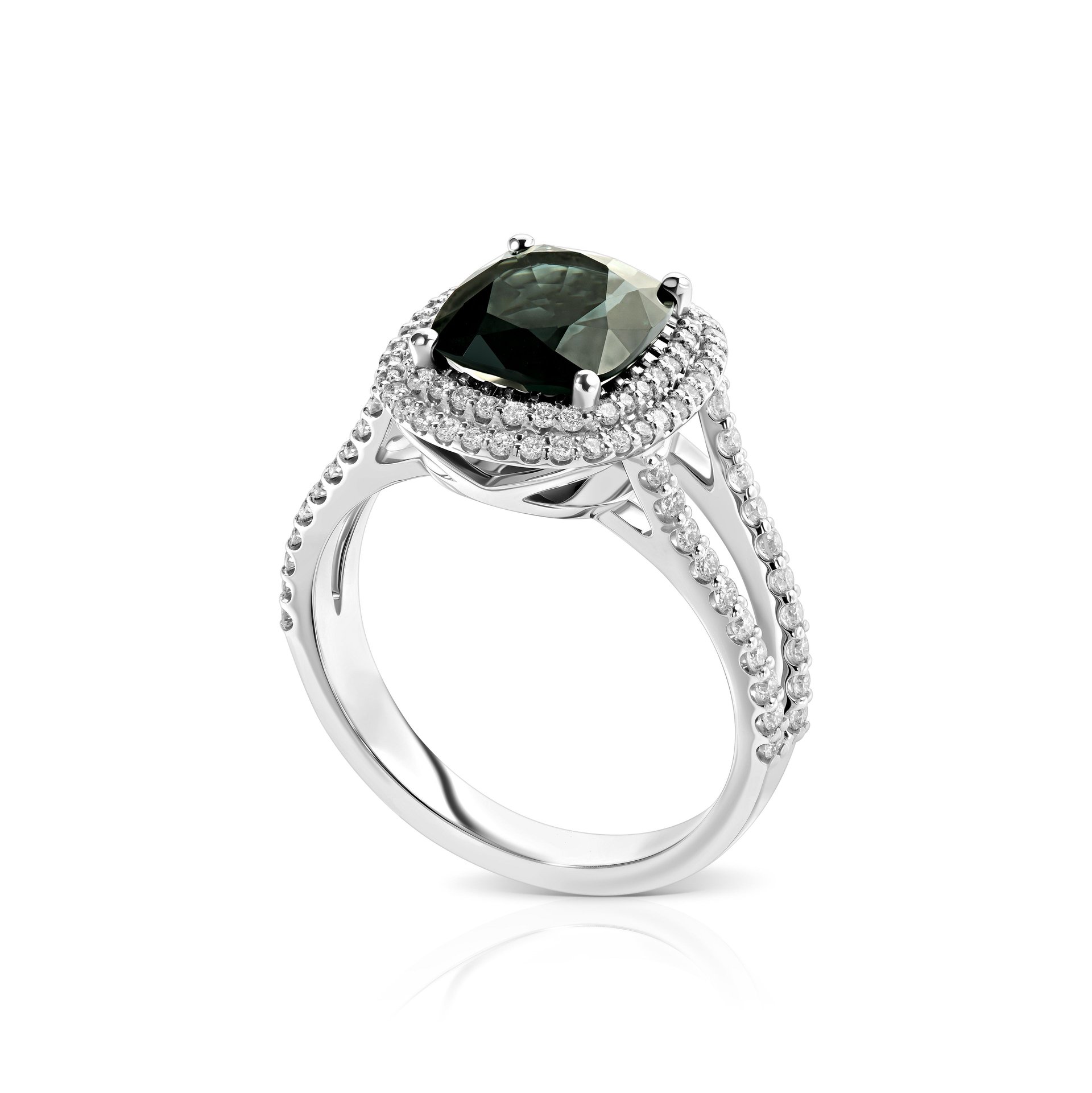 Кольцо со шпинелью весом 2.18 карат выполнено из белого золота 750 пробы и украшено бриллиантами. Центральный камень – шпинель редкого черного оттенка, огранки кушон, привлекает внимание своим глубоким блеском и строгими линиями. Его идеально дополняют боковые бриллианты, общий вес которых составляет 0.519 карат. Двойная инкрустация на оправе добавляет кольцу утонченности и завершенности. Элегантный дизайн сочетает в себе классические и современные элементы, что делает это украшение идеальным выбором для тех, кто ценит индивидуальность. Это изделие было создано в нашей ювелирной дизайн-студии Parure Atelier с вниманием к каждой детали и высоким качеством исполнения.