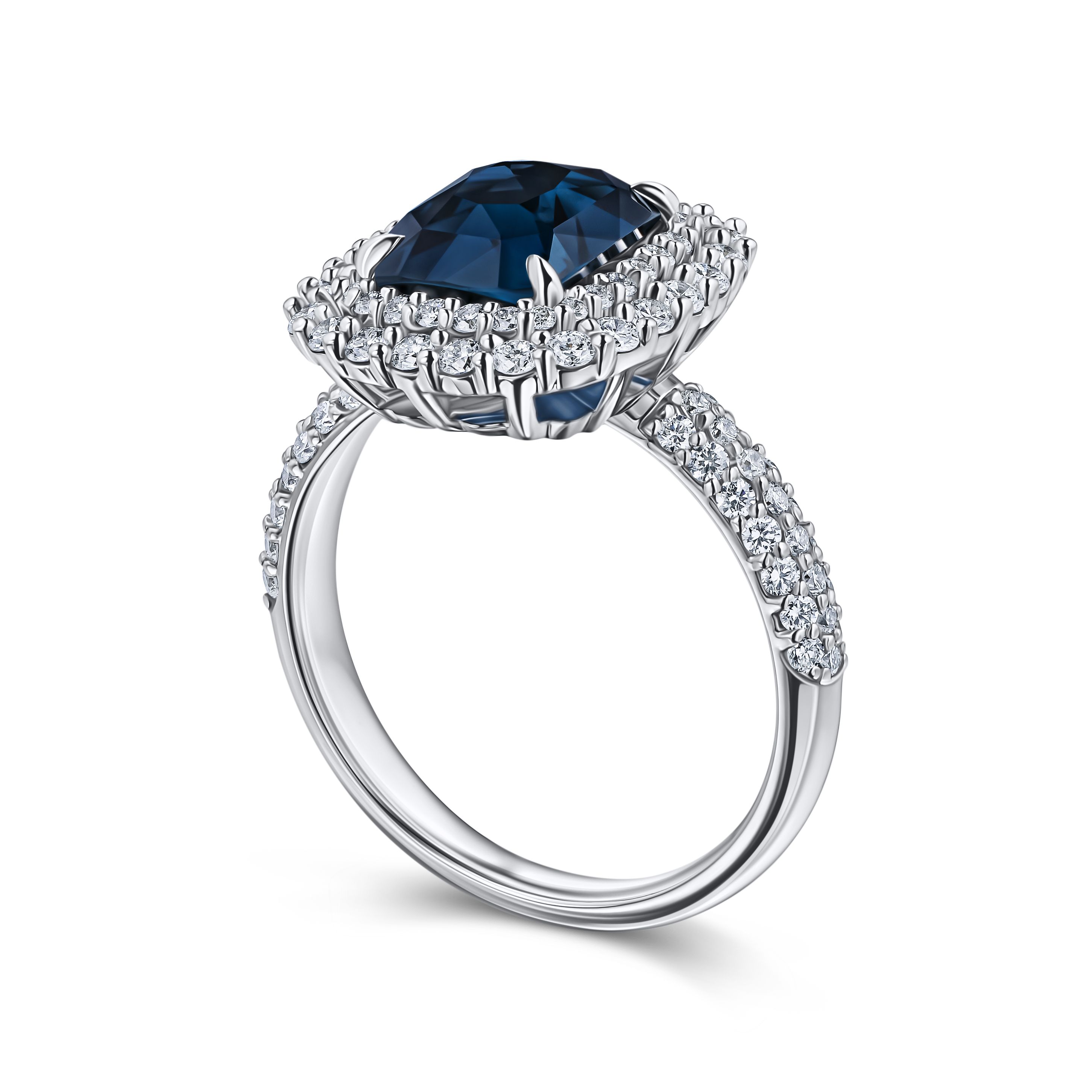 Кольцо со шпинелью 2.52 карата привлекает внимание глубоким синим оттенком центрального камня, который занимает главное место в дизайне украшения. Шпинель весом 2.52 карата отличается насыщенной игрой света и выразительной структурой огранки. Обрамляющие камень бриллианты подчеркивают его красоту, образуя двойной ряд вокруг шпинели и продолжая украшать плечи кольца, создавая эффект легкости и воздушности. Изделие выполнено из белого золота, что придает ему современный и сдержанный вид, выгодно раскрывая цвет камней.