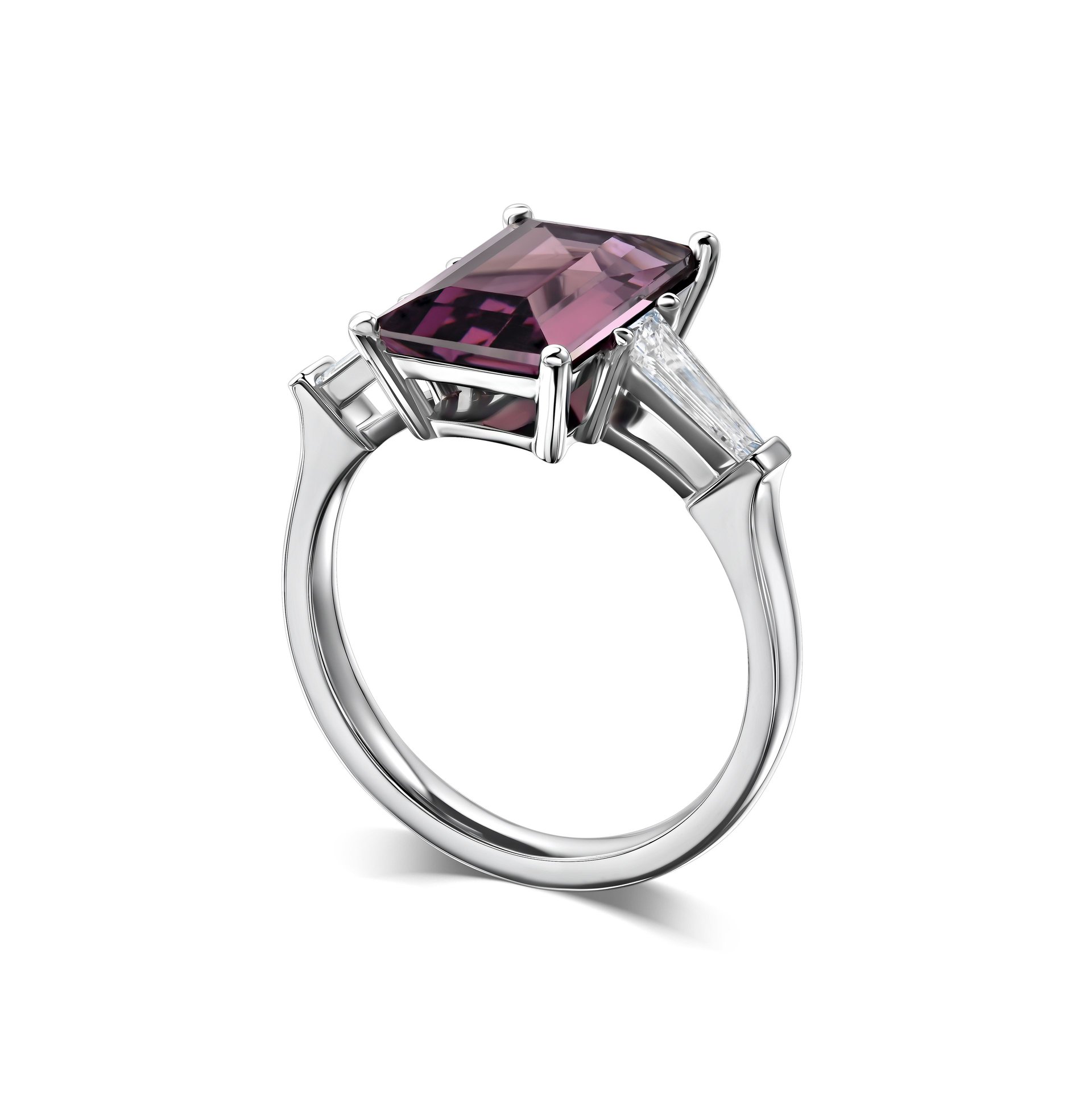 Ювелирное кольцо, воздвигающее на пьедестал изысканности центральный камень шпинель, весом 3.19 карат, огранённый в форме багета, представляет собой уникальное творение нашей дизайн-студии Parure Atelier. Это изделие из белого золота пробы 750, инкрустировано боковыми камнями — бриллиантами общим весом 0.40 карат, огранёнными в тапер-багет. Дизайн кольца характеризуется чистотой линий и строгой геометрией, подчёркивающей глубокий цвет шпинели. Это украшение идеально подходит для тех, кто ценит уникальность и качество исполнения.