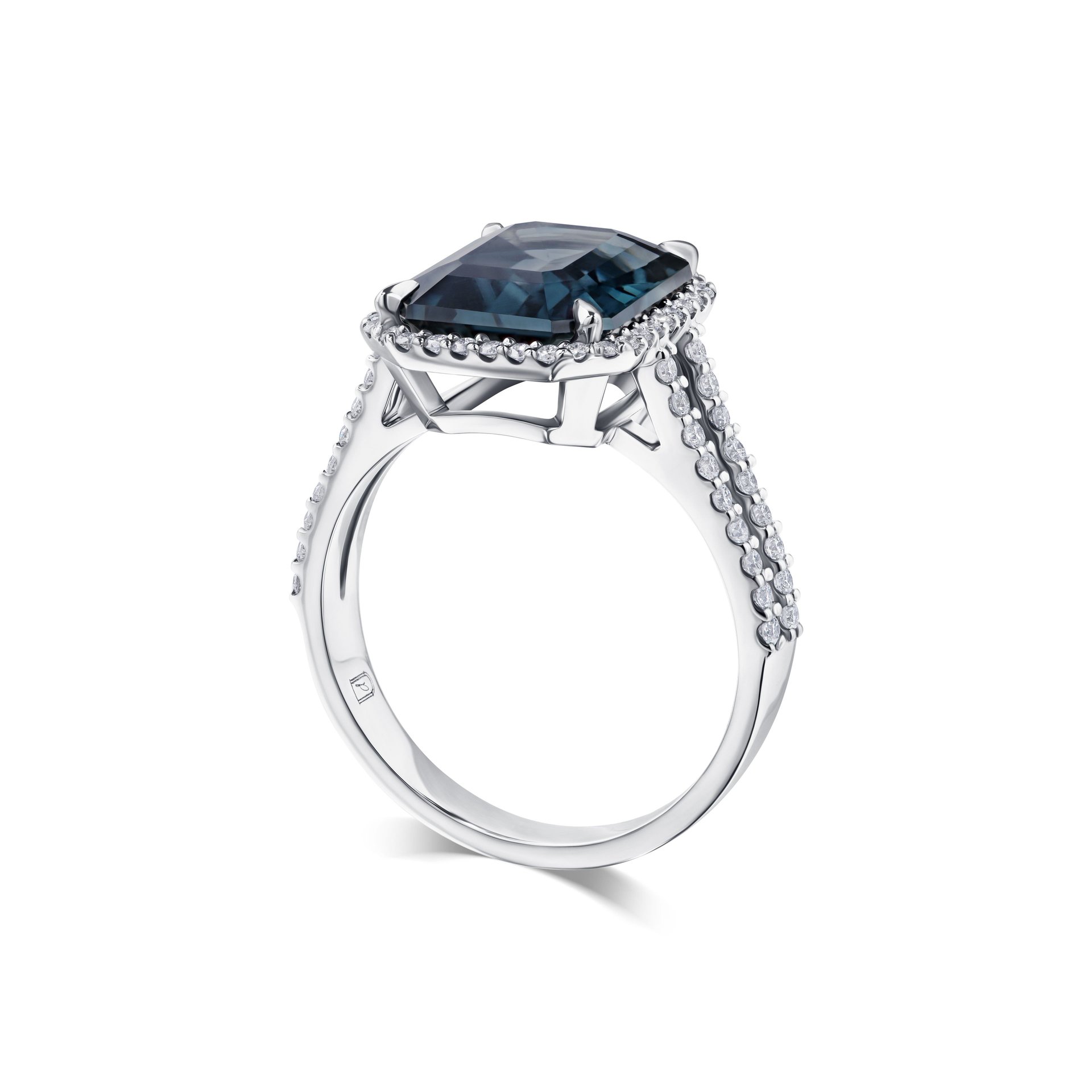 Кольцо со шпинелью 4.56 карата — это воплощение утонченной элегантности. Центральный камень, насыщенный глубоким синим оттенком, привлекает внимание своей загадочной глубиной и блеском. Его изумительная огранка позволяет свету играть на гранях, создавая эффект мерцающей воды. Обрамление из белого золота подчеркивает благородство шпинели, добавляя изделию современный и изысканный вид.