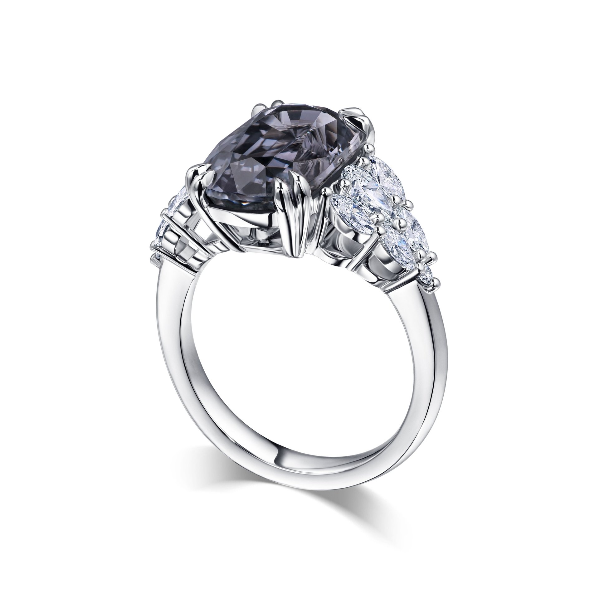 Кольцо со шпинелью 6.19 карат привлекает внимание крупным центральным камнем насыщенного темного оттенка. Шпинель, обладающая выразительной глубиной цвета, занимает главное место в композиции, подчеркивая сдержанность и оригинальность изделия. По бокам расположены аккуратные группы из прозрачных бриллиантов, которые усиливают игру света и добавляют изделию изящества. Металл белого золота служит элегантным и нейтральным фоном, позволяя камням раскрыть всю свою природную красоту и блеск.