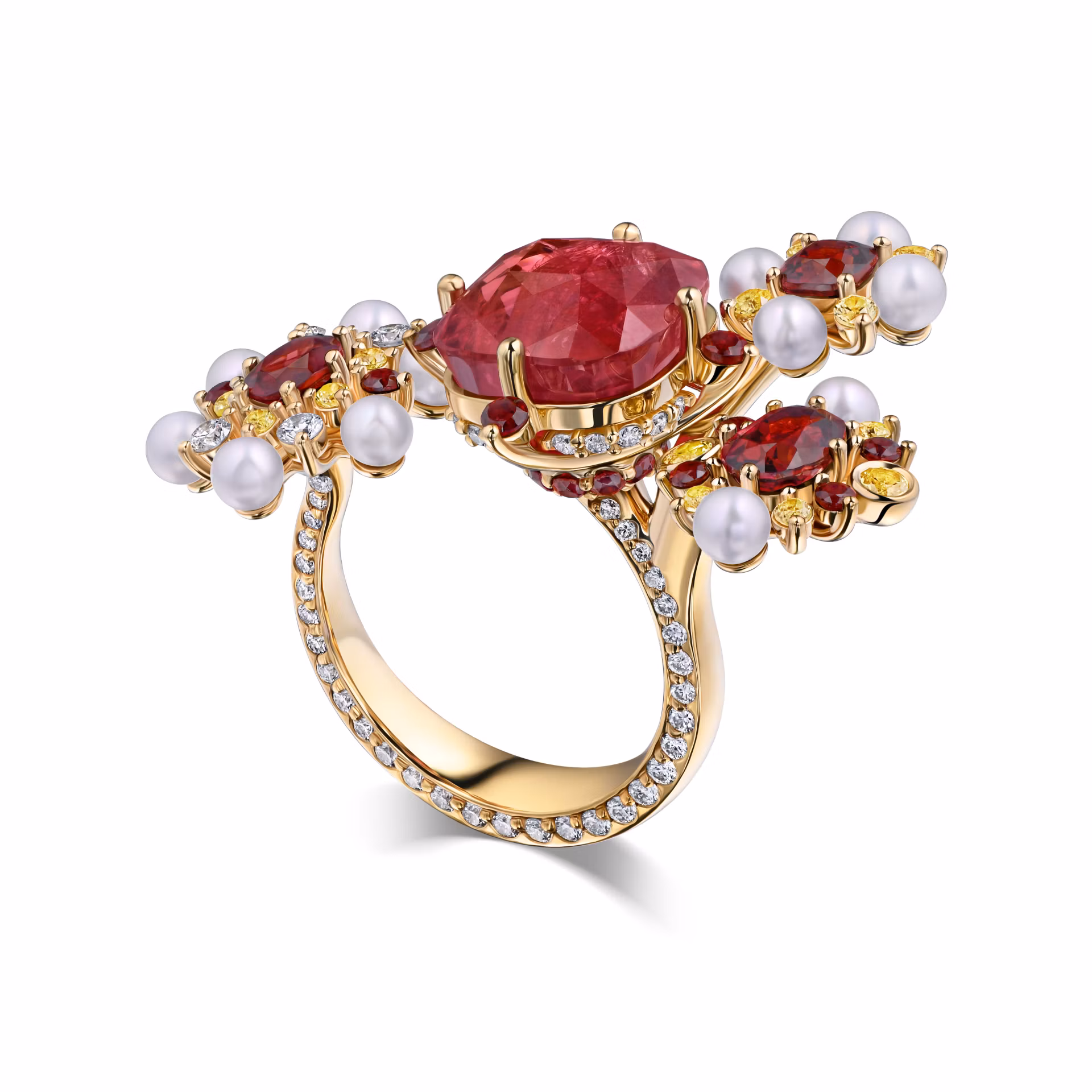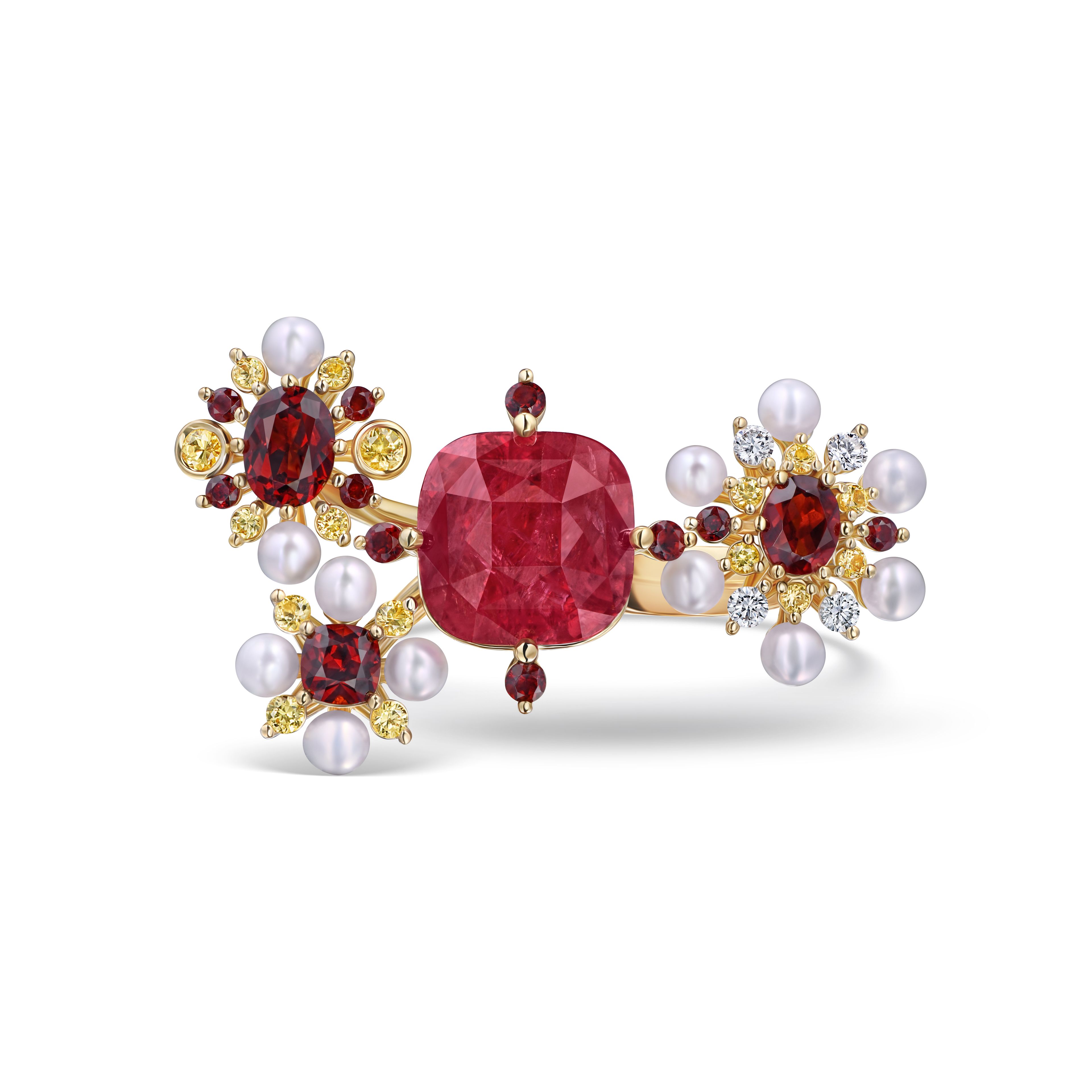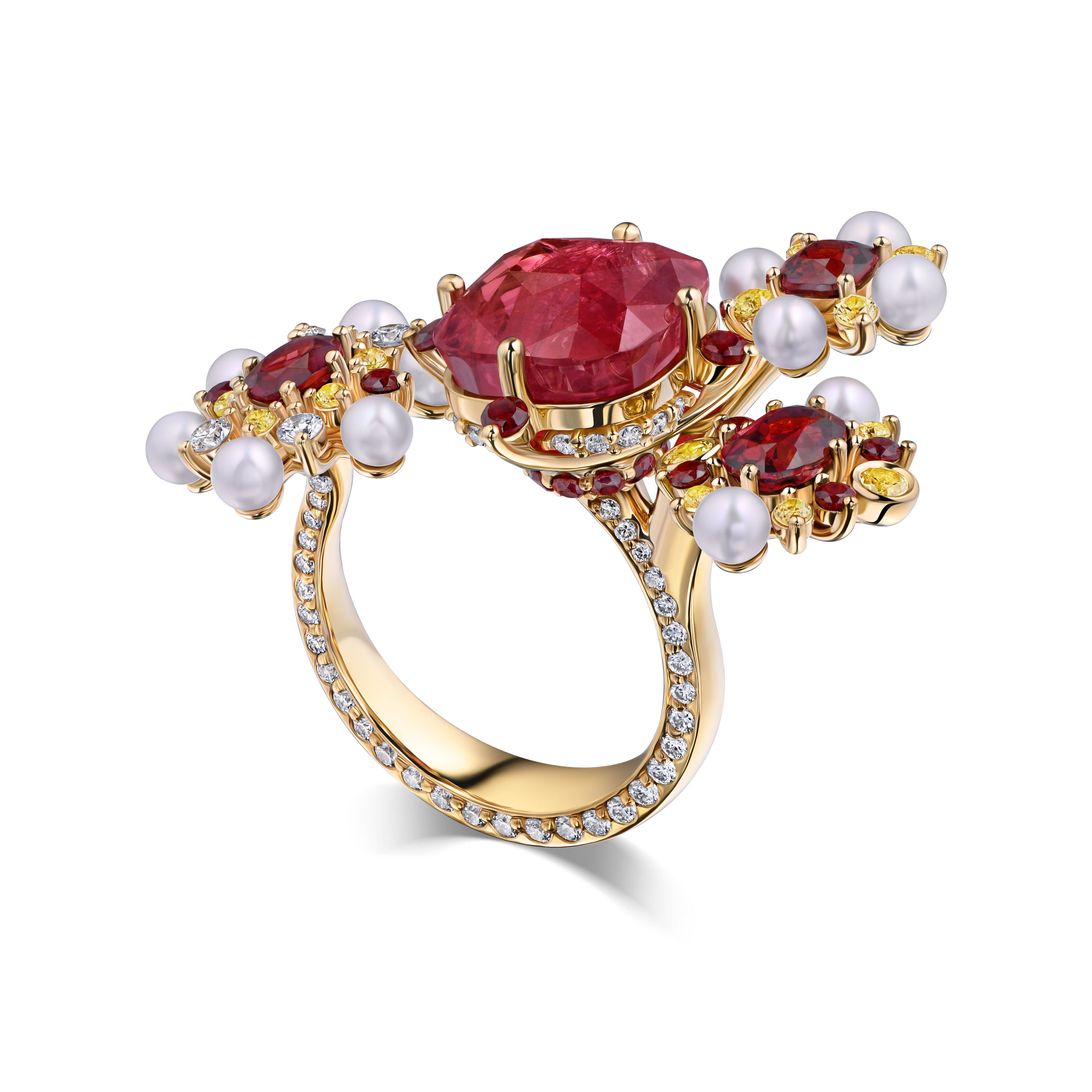 Кольцо навеяно итальянским стилем XVII века. Сердце композиции — 8,70-каратная шпинель того же красного оттенка, что и драгоценный камень на платье героини, пронизанный светом. Барочные узоры выложены жемчугом, гранатами, бриллиантами и жёлтыми сапфирами.