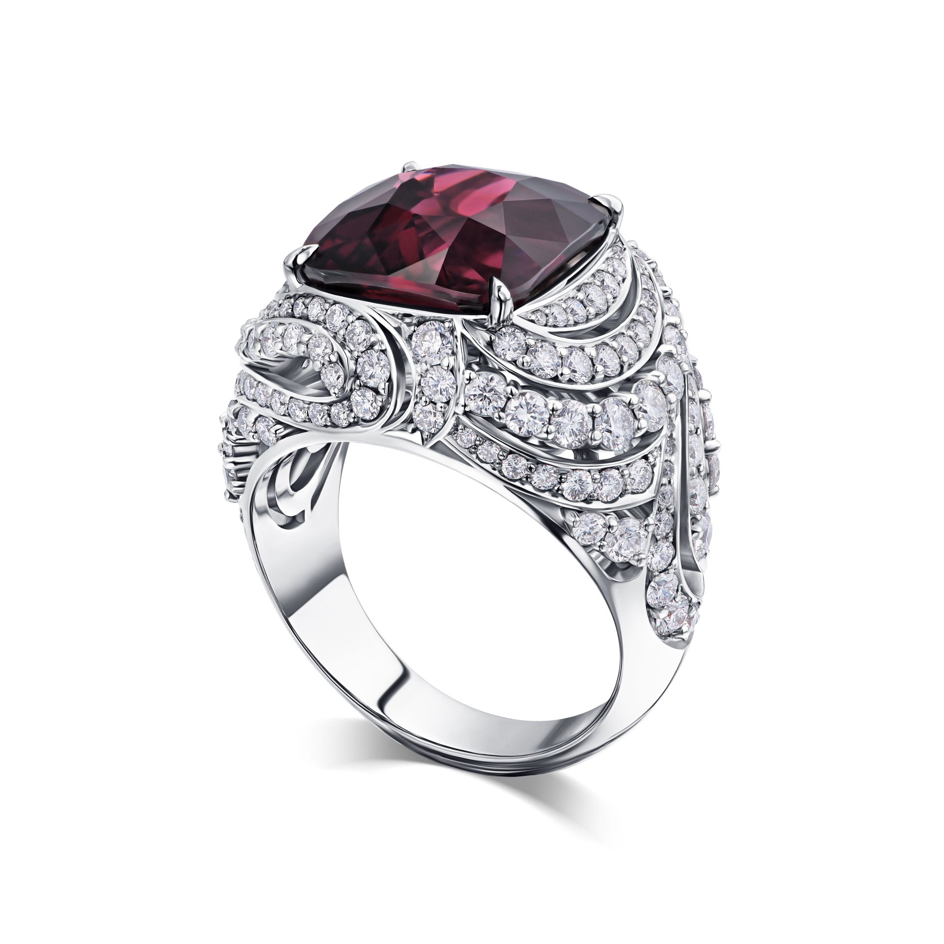 Это кольцо — воплощение гармонии и элегантности, где каждый элемент подчеркивает природную красоту центрального камня. Великолепная шпинель весом 9.09 карата завораживает своим глубоким оттенком, привлекая внимание к изысканным линиям дизайна. Окружающие бриллианты, общей массой около 2.006 карата, сверкают в оправе из белого золота, создавая эффект сияющего ореола вокруг центрального камня.